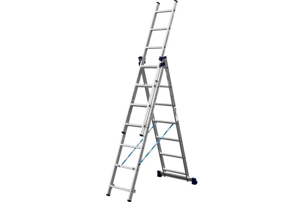 Универсальная трехсекционная лестница СИБИН применяется при проведении монтажных и строительных работ, для выкладки товара в магазинах и на складах. Возможно использование как в качестве стремянки, так и в качестве приставной лестницы. Изготавливается из алюминиевого сплава. В состав входят страховочные ленты (изготовленные из стали), поперечный стабилизатор, противоскользящие ступени. Упрощает монтаж и демонтаж различных изделий. Прочное соединение ступеней с боковинами.