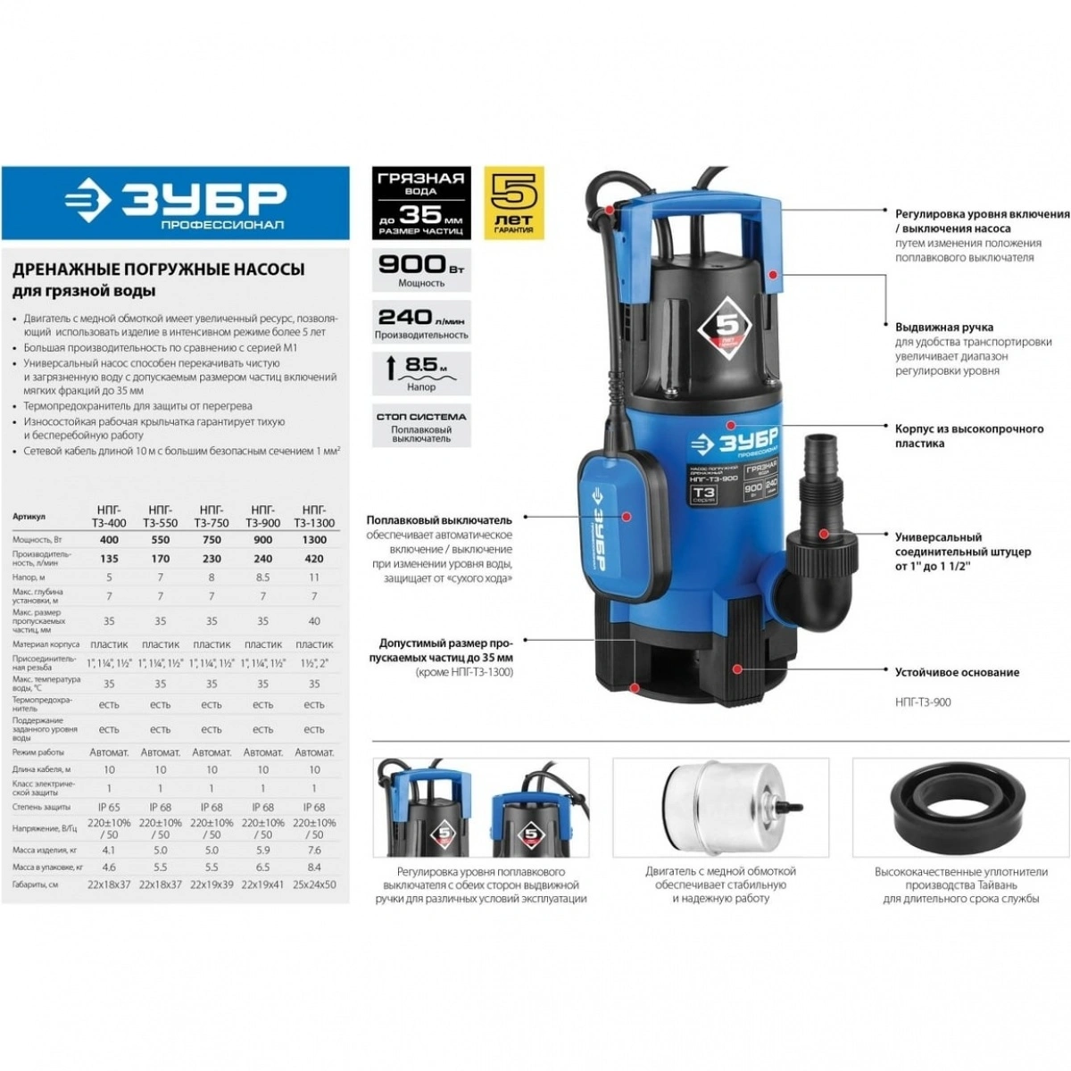 Насос погружной дренажный Зубр Профессионал Т3 НПГ-Т3-900 - описание товара, его характеристики, фото и цены представлены на карточке товара. Чтобы купить этот товар по цене 6421 руб., свяжитесь с нами по телефону 8(812)426-98-99 в Санкт-Петербурге, или оформите покупку через корзину.