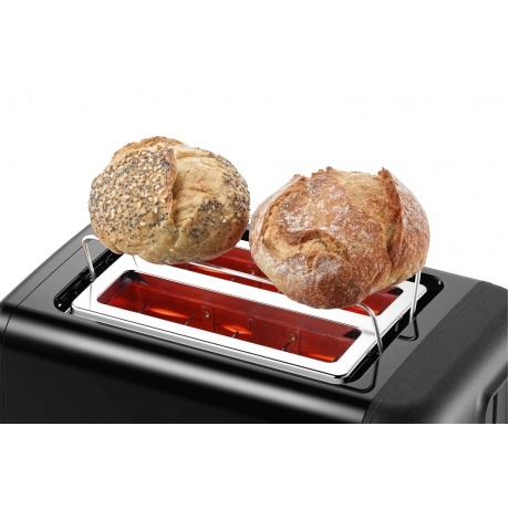 Интегрированная складывающаяся подставка для подогрева выпечки. Настройки разморозки и разогрева: размораживает тост и делает его хрустящим. Автоматическое центрирование тостов. High Lift: позволяет легко вытащить даже небольшие кусочки хлеба. Автоматическое отключение: выключает тостер, когда хлеб застревает.