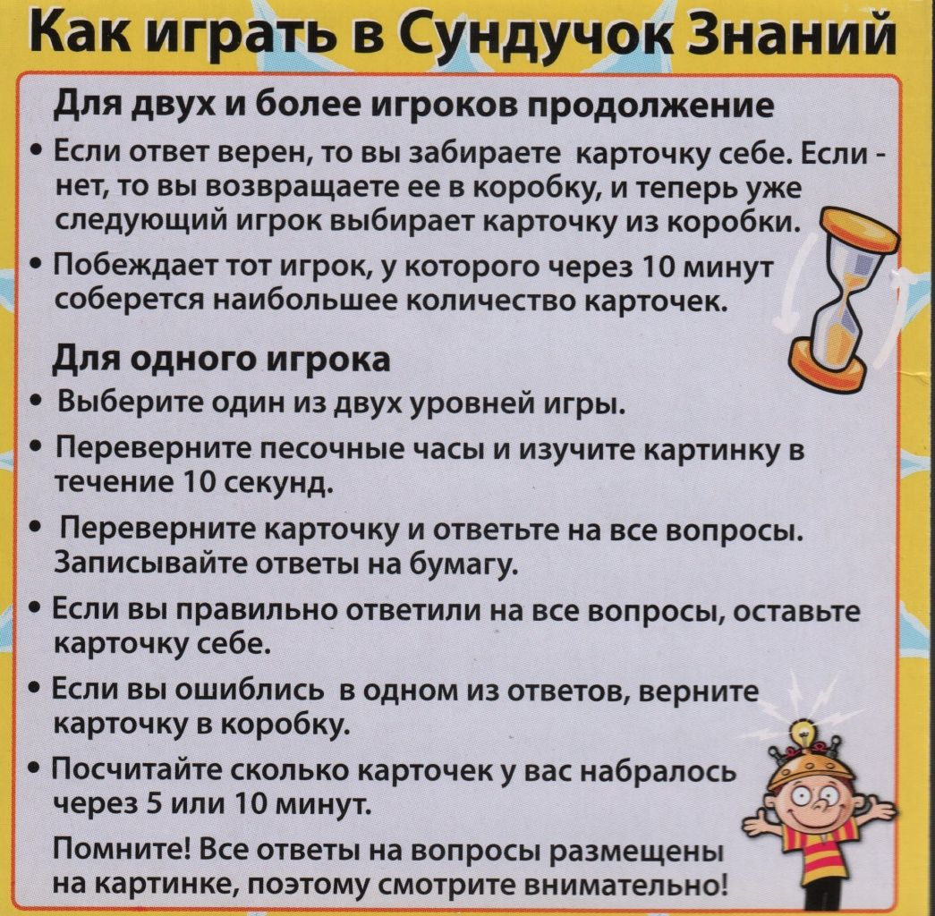 Если вы играете с друзьями, то первый ход отдается младшему из игроков. Данный игрок достает карточку из коробки, переворачивает песочные часы, и в течение 10 секунд старается запомнить все, что на ней нарисовано и написано.