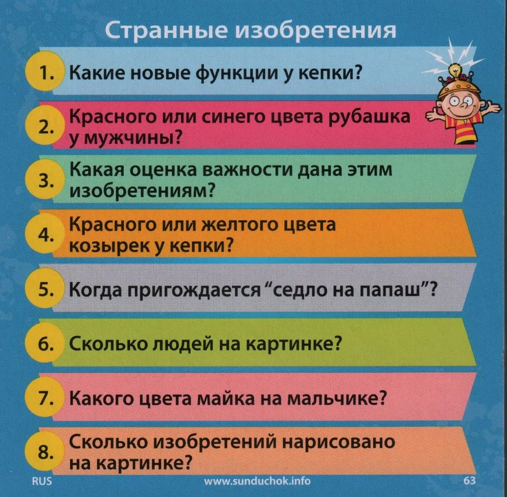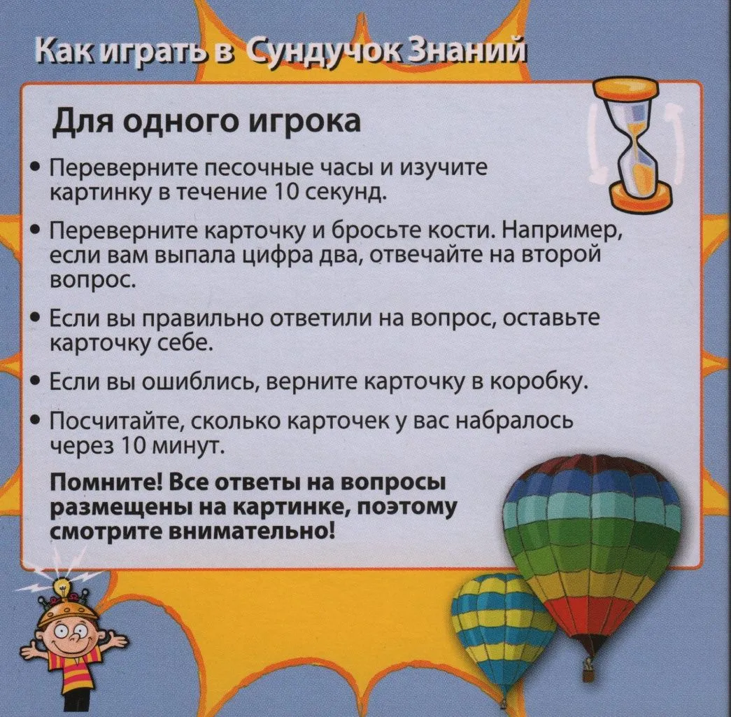 Если вы играете с друзьями, то первый ход отдается младшему из игроков. Данный игрок достает карточку из коробки, переворачивает песочные часы, и в течение 10 секунд старается запомнить все, что на ней нарисовано и написано.