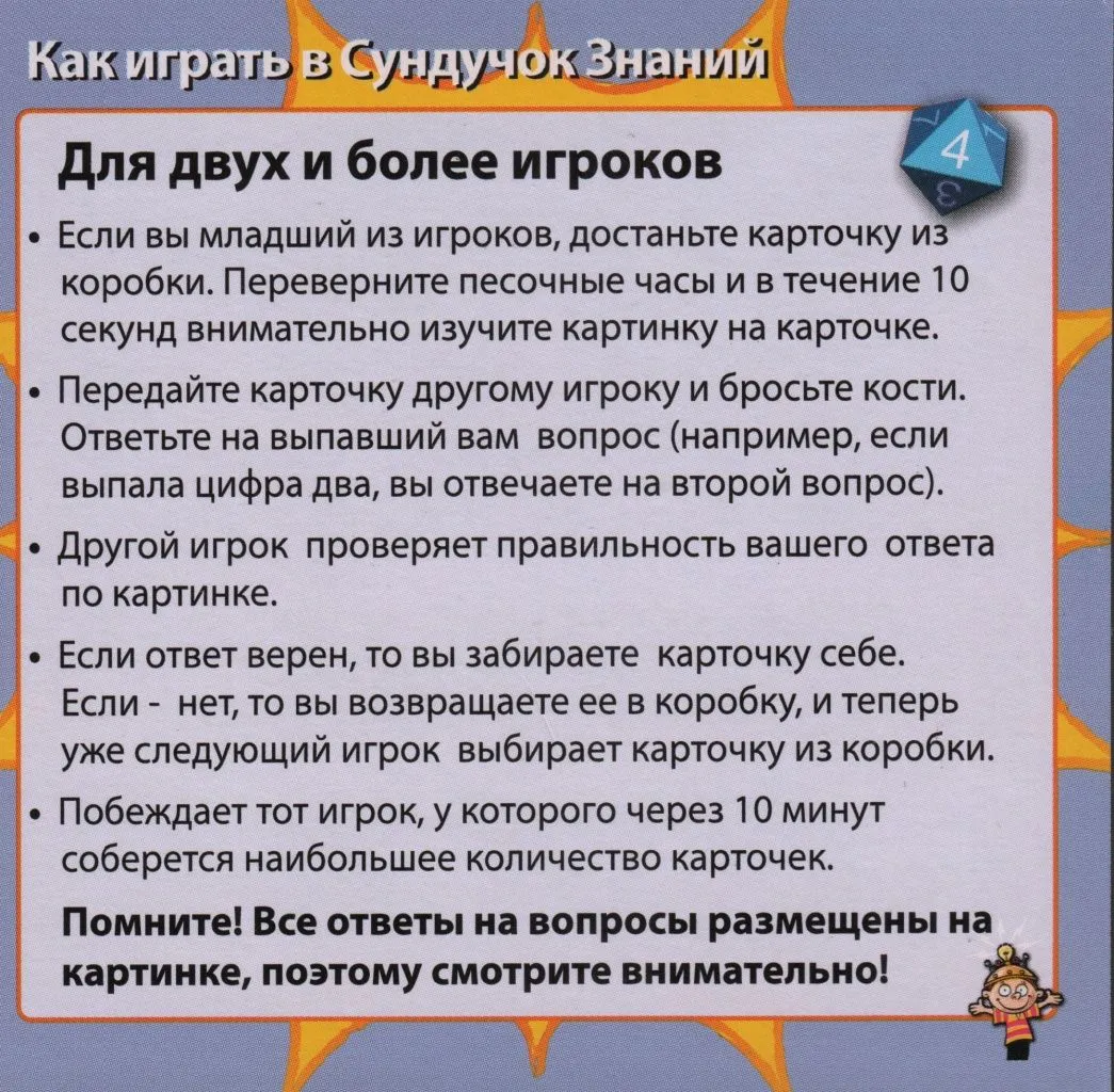 Затем он должен отдать карточку другому игроку и, бросив кости, ответить на тот вопрос, номер которого выпал на костях. Другой игрок проверяет правильность ответа, и если первый ответил верно, то карточку он оставляет себе, а если нет — возвращает обратно в коробку. Побеждает тот, кто в течение 10 минут соберет наибольшее количество карточек.