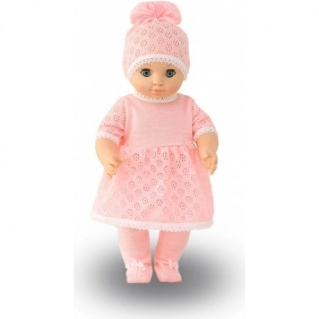 Кукла из серии "Малыши и малышки", одетая как девочка. В комплект одежды входят: вязаное платье с короткими рукавами, с застежкой сзади на "Велкро". Колготки, вязанные гладью. Вязаная шапочка. На низ шапочки настрочено эластичное кружево. Верх шапочки собран в пучок, закреплен атласной лентой, завязанной бантом.