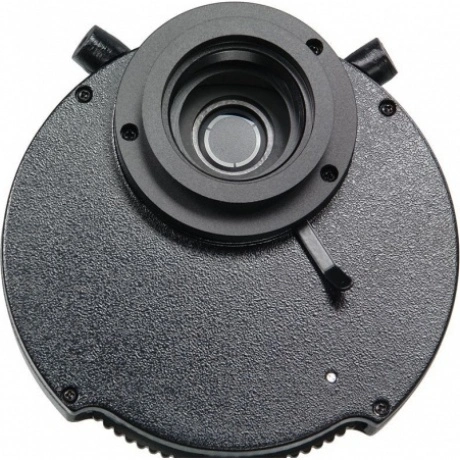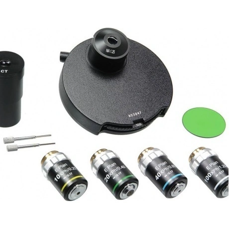 Рассчитан на тубус бесконечность. Устанавливается в микроскоп вместо конденсора Аббе для исследований по методу фазового контраста. Поставляется в комплекте с фазовыми объективами и вспомогательным микроскопом (D 30 мм). Крепление ласточкин хвост. Фазово-контрастное устройство для Микромед 3 LED M предназначается для исследования малоконтрастных объектов, не видимых в микроскоп при наблюдении по методу светлого поля. Основными частями устройства являются фазовый конденсор, фазовые объективы и вспомогательный микроскоп. Крепление фазового конденсора типа ласточкин хвост. В комплект входят фазовые объективы-планахроматы 10х/0,25, 20/х0,40, 40х/0,65, 100х/1,25. Объективы рассчитаны на длину тубуса бесконечность и толщину покровного стекла 0,17 мм. Принцип действия устройства основан на методе фазового контраста, позволяющем наблюдать неокрашенные малоконтрастные препараты. Конденсор может быть использован для наблюдения обычным способом, для этого под револьверным диском имеется ирисовая диафрагма, а в диске револьвера, кроме кольцевых диафрагм, имеется свободное отверстие для пропускания всего пучка света. Фазовый конденсор вставляется в кольцо кронштейна конденсора микроскопа вместо обычного светлопольного конденсора. Смена кольцевых диафрагм, в зависимости от применяемого объектива, производится поворотом револьверного диска за накатанную часть до фиксации, причем в окне кожуха конденсора должна появиться цифра, соответствующая увеличению применяемого объектива или буквы «BF», соответствующие свободному отверстию. Вспомогательный микроскоп применяется при центрировке изображения кольцевой диафрагмы конденсора относительно фазового кольца объектива. Фазово-контрастная микроскопия - это метод исследования, основанный на получении с помощью специальных приспособлений контрастного изображения различающихся по плотности структур бесцветных прозрачных микрообъектов (например, живых микроорганизмов и тканевых культур). При прохождении пучка света через неокрашенный объект изменяется лишь фаза колебания световой волны, что не воспринимается человеческим глазом. Чтобы изображение стало контрастным, необходимо превратить фазовые изменения световой волны в видимые амплитудные. Это достигается с помощью фазово-контрастного конденсора и фазового объектива.