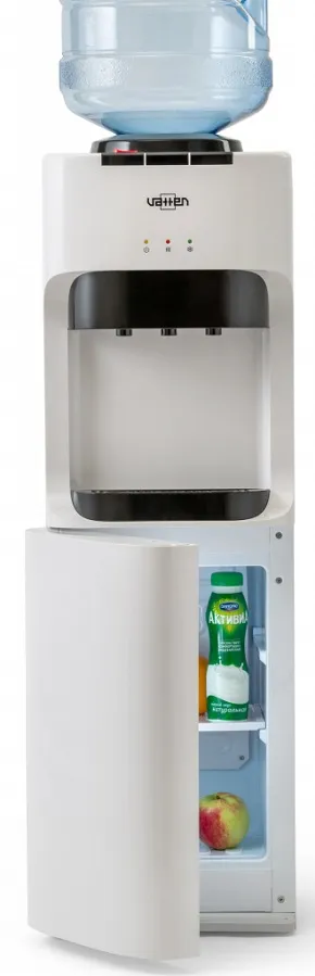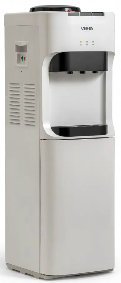 Кулер для воды Vatten V45WKB оборудован тремя краниками, отвечающими за подачу горячей, холодной и воды комнатной температуры. На передней панели кулера расположены индикаторы, отображающие активный режим работы. В нижней части корпуса расположен шкафчик-холодильник.