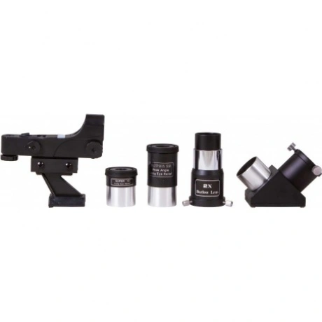 Sky-Watcher SKYMAX BK MAK90EQ1 понравится тем, кто не любит расставаться с телескопом во время поездок и путешествий, а также предпочитает вести наблюдения вне городской засветки. Эта модель собрана по схеме Максутова-Кассегрена, поэтому весьма компактна и не занимает много места. При этом в телескоп видно многое: Луну, планеты Солнечной системы, туманности, галактики и звездные скопления. А так как в комплект поставки включено диагональное зеркало, телескоп можно использовать и в качестве зрительной трубы – для изучения наземных ландшафтов. Среди других телескопов Sky-Watcher SKYMAX BK MAK90EQ1 выделяется благодаря настольному штативу. Он используется вместо стандартной треноги. Телескоп можно поставить на стол, например, на веранде загородного дома или на балконе городской квартиры. Штатив легко и удобно складывается, что обеспечивает комфорт в дороге. И хотя многие настольные телескопы комплектуются упрощенными монтировками или монтировками азимутального типа, эта модель – исключение. Оптическая труба установлена на EQ1 – экваториальную монтировку, с помощью которой удобно следить за перемещением астрономических объектов по небосклону. Этот тип монтировки предпочтительнее при изучении космоса. Для управления используются ручки тонких движений. Чтобы вам было удобно путешествовать с телескопом, в комплект поставки включена текстильная сумка. У нее есть удобная ручка для переноски и плечевой ремень. В сумку легко помещаются оптическая труба, монтировка, штатив и все комплектные оптические аксессуары.