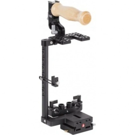 Устройство изготовлено из алюминия и представляет собой быстроразьемную регулируемую по высоте раму, которая подходит для крупных зеркальных фотокамер. Система стабилизации включает в себя реверсивную верхнюю рукоятку, которая может быть перемещена, когда используется адаптер XLR. Ручка может также складываться при упаковке системы и даже может быть переконфигурирована на левостороннее положение. В системе предусмотрено крепление холодный бошмак, а также ?? и 3/8? для установки оборудования. Для защиты видеокабелей и предотвращения повреждения портов предусмотрен специальный зажим.