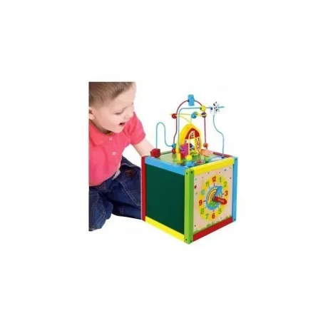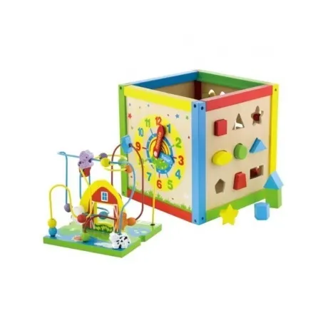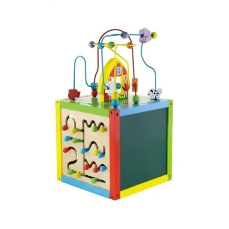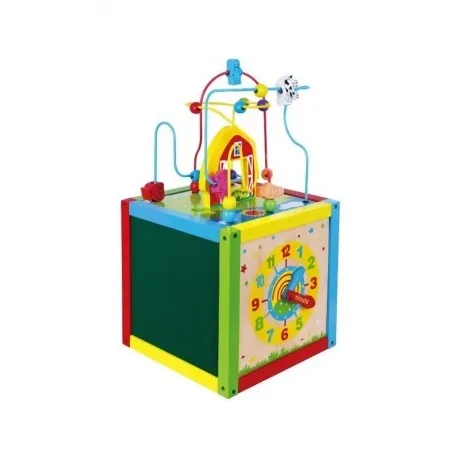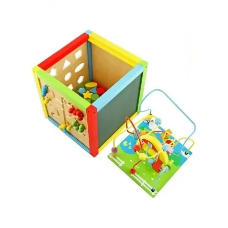 Деревянный игровой центр 5-в-1 содержит проволочный лабиринт с забавными фигурками, сортер, доску для рисования, деревянный лабиринт и часы. Проволочный лабиринт можно перевернуть внутрь кубика для удобства хранения и транспортировки. Игрушка выполнена из высококачественной древесины.