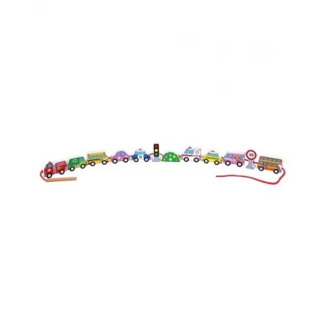 В состав набора входят 12 деревянных фигурок: машинки, светофор, знак, кустарник. В фигурках проделаны сквозные отверстия. Также в набор входит шнурок с деревянной палочкой на конце, на который можно нанизывать фигурки-бусинки.