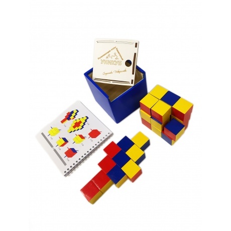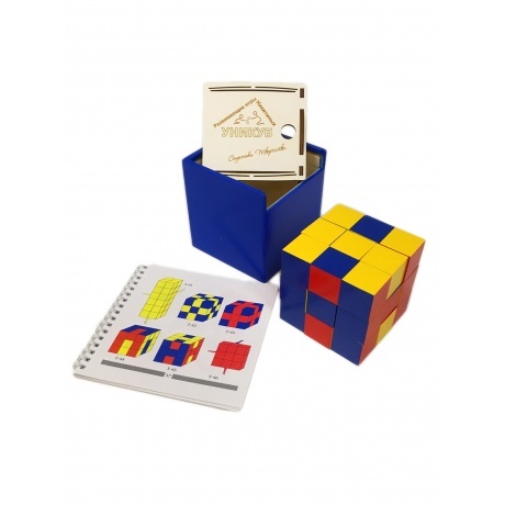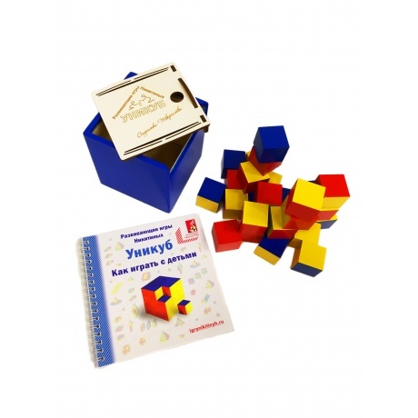 Игра состоит из 27 кубиков, окрашенных в желтый, красный, синий цвета и собранных в куб по определенной схеме. Задания в Уникубе трудные, и требуют от ребенка больших затрат времени и сил, но они расположены в порядке возрастания сложности и это поможет ребенку развить пространственное мышление, научить аккуратности и предусмотрительности, привить навыки точности.