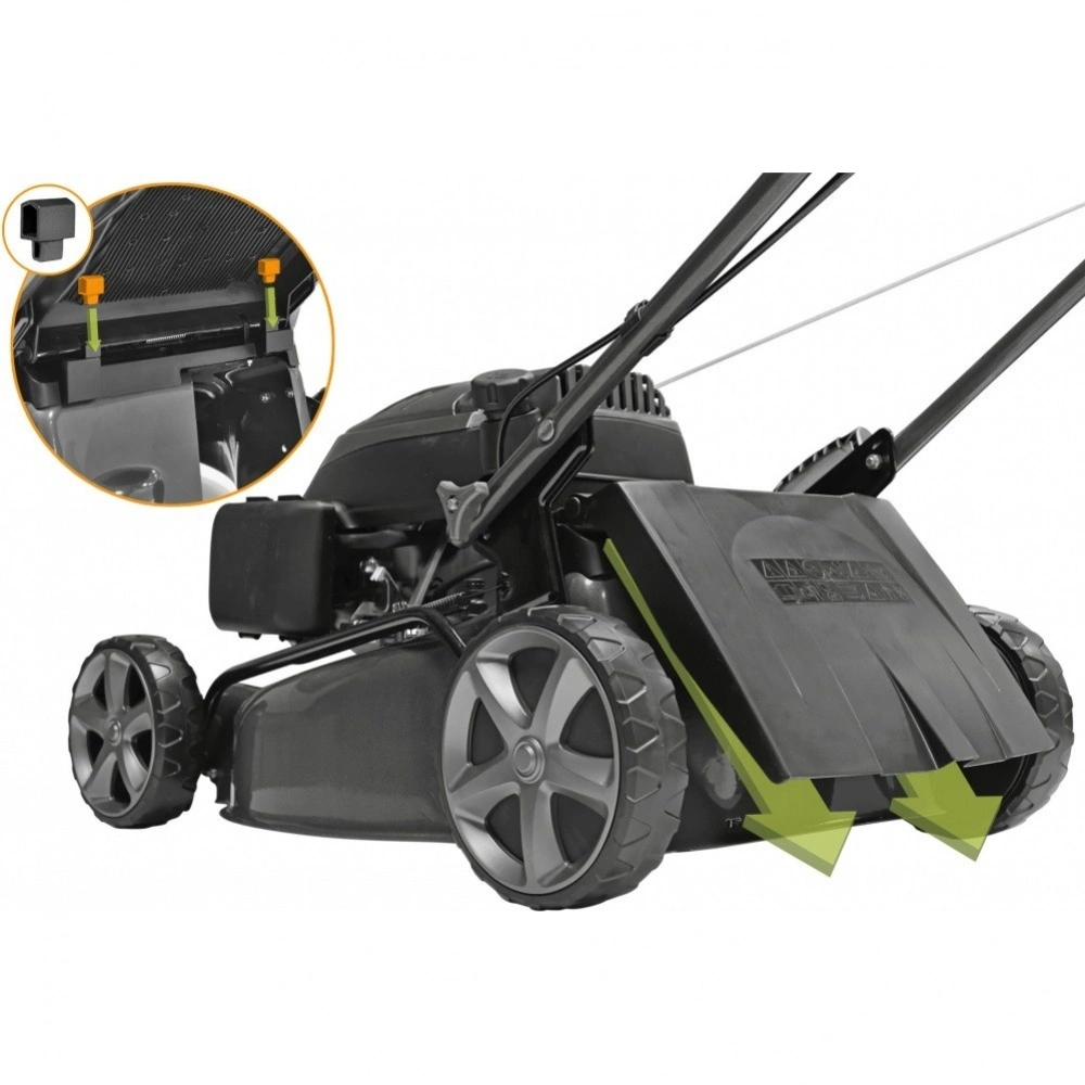 Газонокосилка оснащена вместительным травосборником объемом 45 литров, что снижает необходимость частых опорожнений во время работы. Кроме того, устройство поддерживает функцию мульчирования, которая измельчает скошенную траву и равномерно распределяет ее по поверхности, улучшая качество почвы.