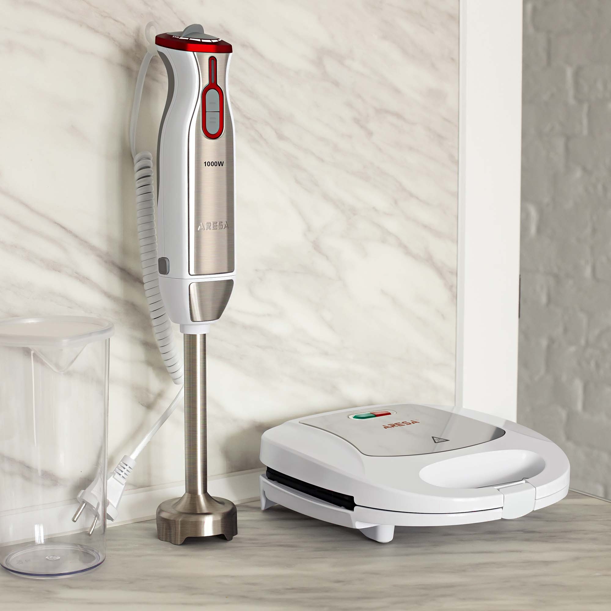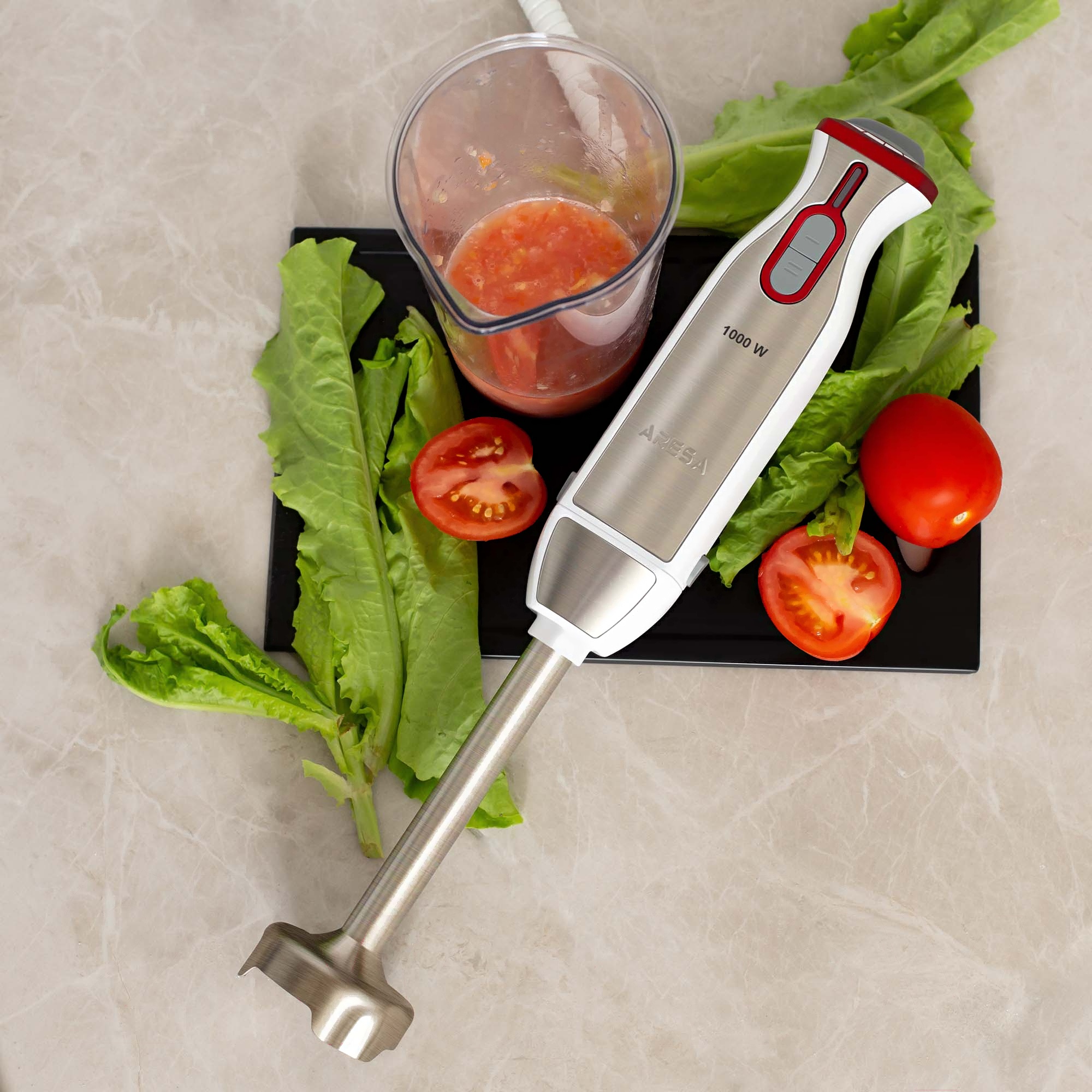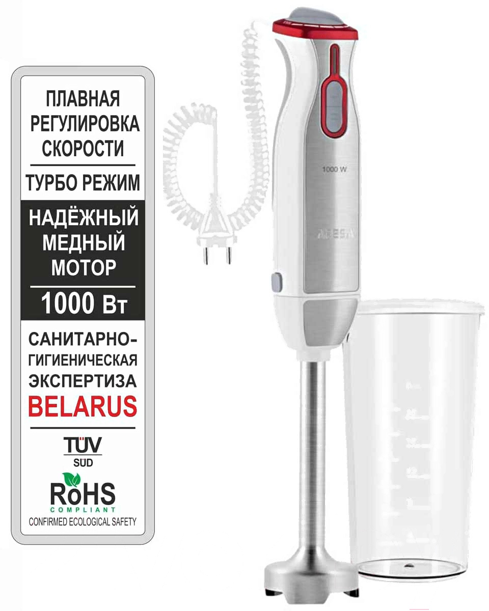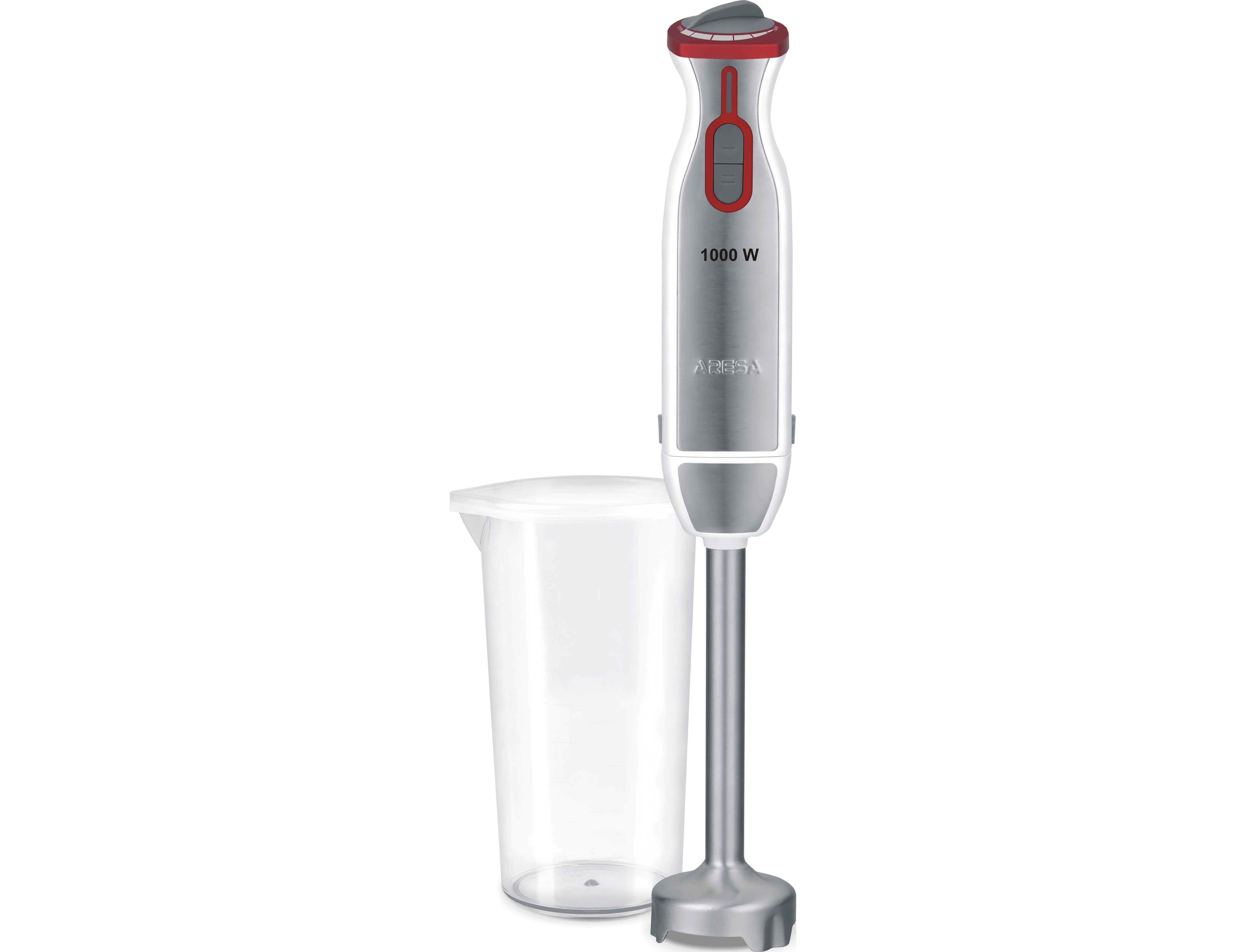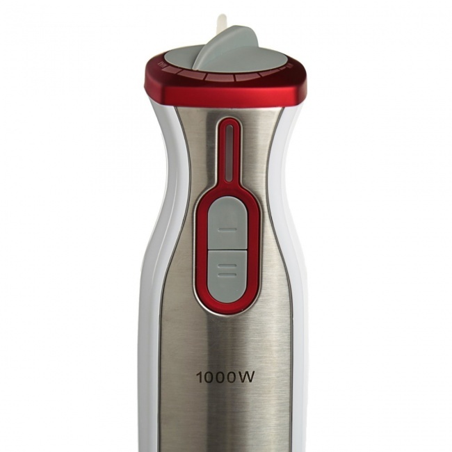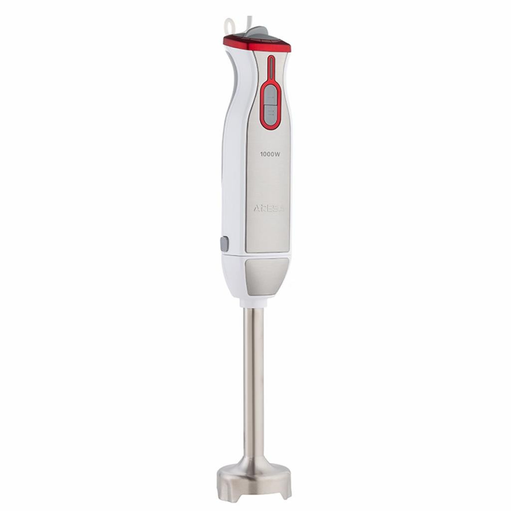 Блендер Aresa AR-1106 погружной имеет компактный ручной дизайн. Прибор представлен в ярком серовато-красном пластиковом корпусе и оснащен прочной металлической рабочей частью. Устройство действует при мощности 1000 Вт и дополняется 6 рабочими скоростями. Модель Aresa AR-1106 дополнена плавной регулировкой скоростей. Блендер поставляется со стаканом 0.6 л и позволяет измельчать продукты.
