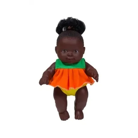 Эта темнокожая малышка разнообразит коллекцию кукол вашего ребенка. Игрушечная девочка такая забавная и милая! С ней можно придумать множество новых игровых ситуаций, ведь она отличается внешностью от остальных кукол. В пупса красивая кожа шоколадного цвета, пушистые мелко вьющиеся волосы, собранные в хвостик. На вас смотрят большие озорные глаза. У куклы подвижные ручки и ножки, голова поворачивается. Она изготовлена из винила. Одежду можно снять и переодеть малышку.