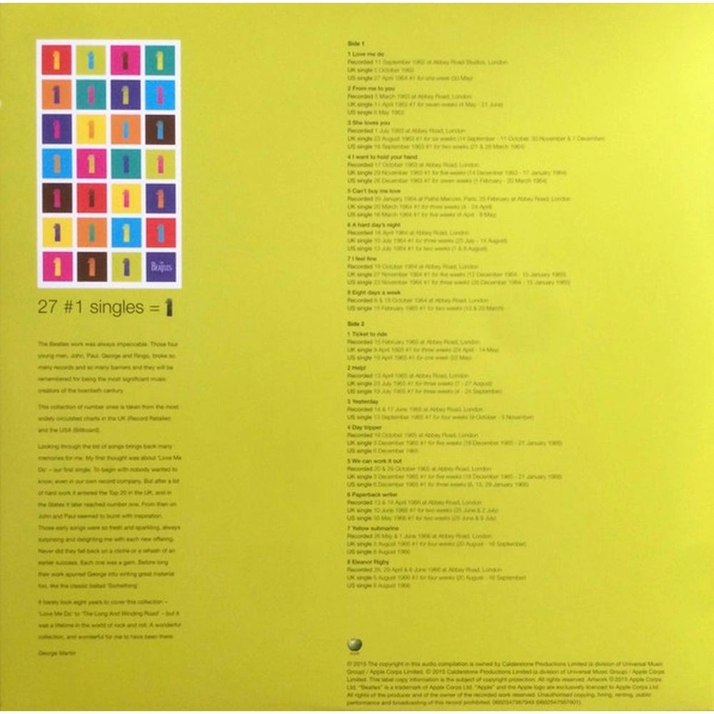 Альбом вышел 13 ноября 2000 года к 30-летию распада группы и был продан тиражом более 31 млн копий . С учетом этого альбома группа «Битлз» стала единственной в мире, чьи альбомы становились лучшими в двух столетиях . Красочное издание в разворотном альбоме . Звук очень качественный .