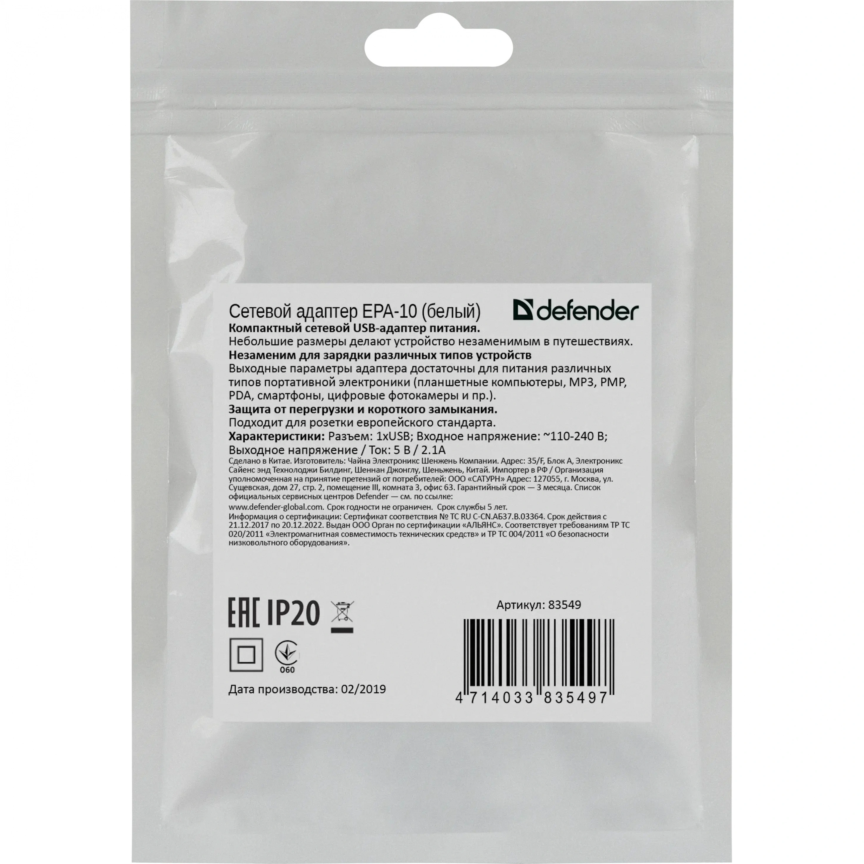 ЗУ Defender EPA-10 оснащено двухштырьковой вилкой и подключается к розетке без кабеля. Допустимый диапазон входного напряжения – от 110 до 240 В. Поддерживаются 2 вида защиты – от короткого замыкания и перегрузки.