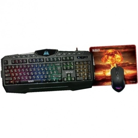 Wartime! Время наступать и обрушиться на противника со всей мощью! В этом наборе от компании Qumo много света и цвета. RGB подсветка клавиатуры и мыши, коврик с агрессивным, ярким рисунком – всё это составляет готовое решение для игр, работы и оформления компьютерного места. Средние вес и размеры достаточно универсальны, манипулятором удобно пользоваться. Кабель в оплетке не будет вносить искажения в активные игровые действия пользователя.