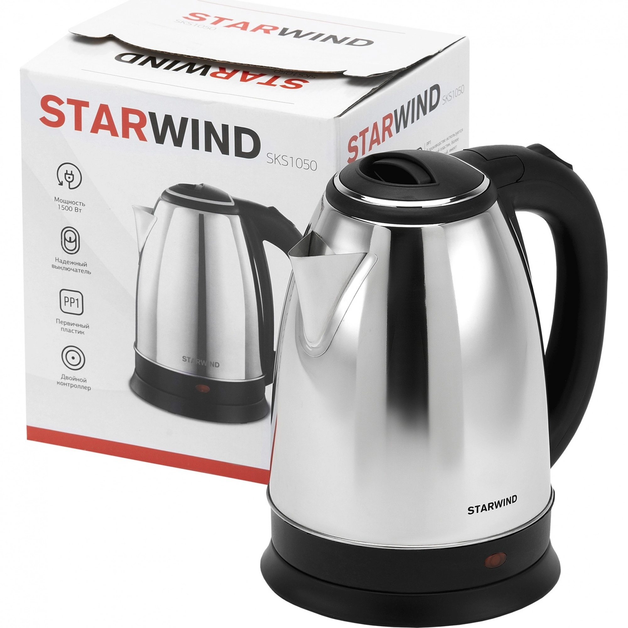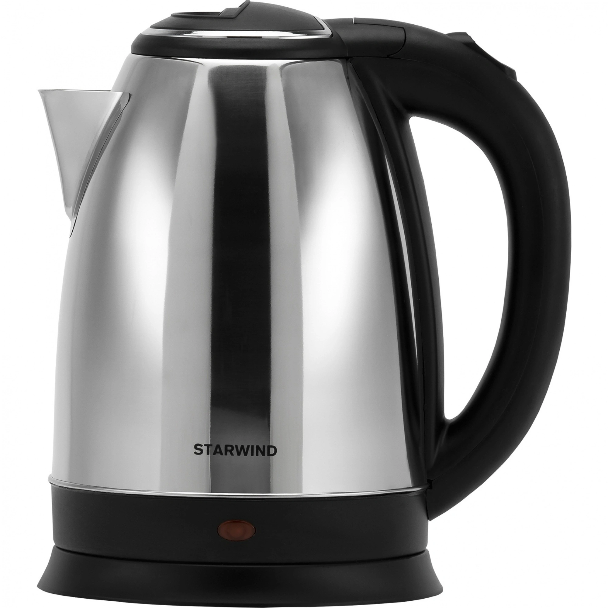 Чайник Starwind SKS1050 серебристый/черный (Уценка - ВТ1)Электрический чайник стал просто незаменимым прибором в каждом доме или офисе. И не удивительно, ведь с его помощью можно в разы быстрее закипятить воду на различные нужды, а для работы не требуется газа или каких-либо особых условий, кроме как подключения к электросети 220 В. Модель электрического чайника STARWIND SKS1050 идеально справится со своей прямой задачей, но помимо этого, она максимально просто в управлении и безопасна в эксплуатации. Корпус, носик и внутренняя часть чайника, которая контактирует с водой, изготовлены из нержавеющей стали. Основные элементы: ручка, крышка и подставка выполнены из пластика черного цвета.