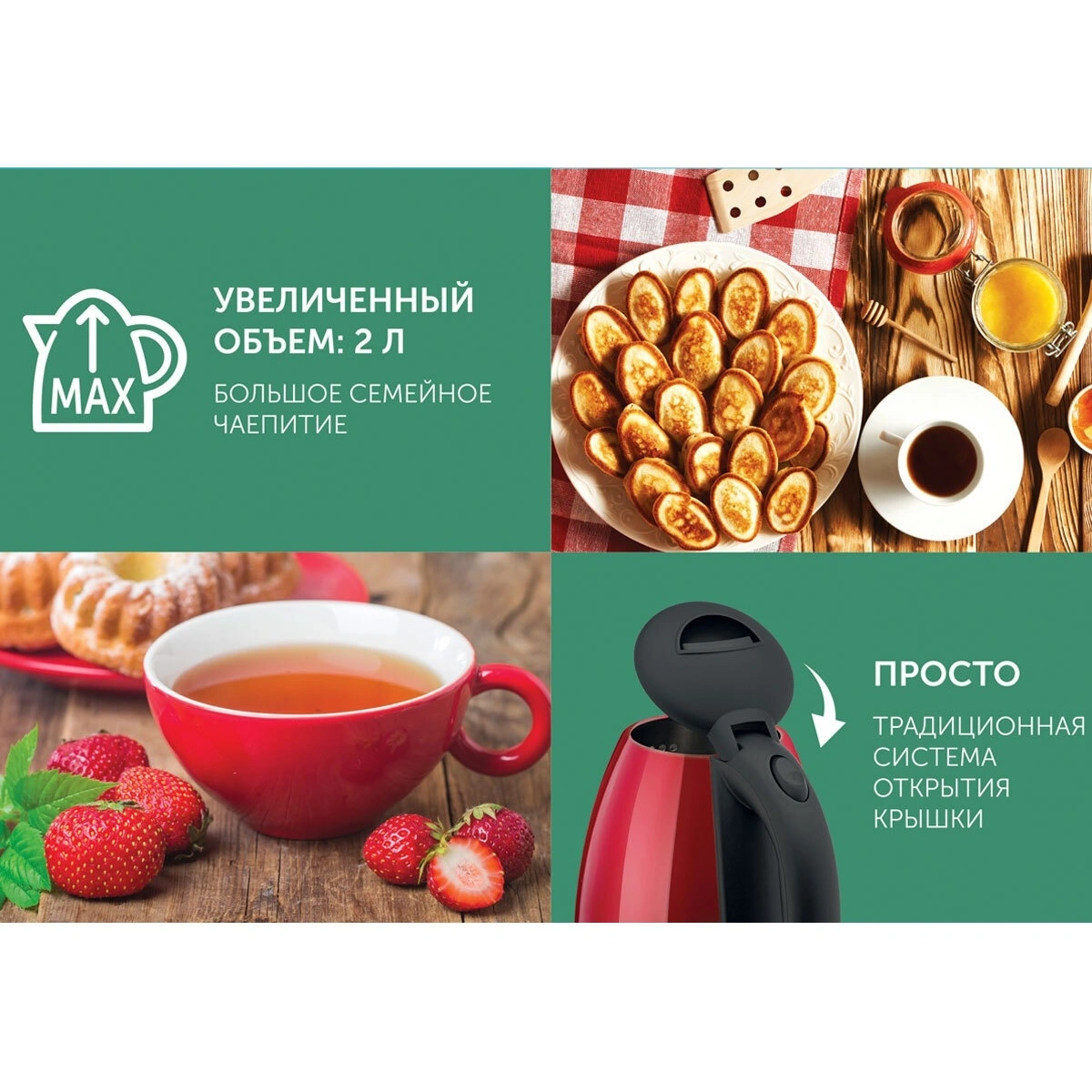 Тип: электрочайник; Мощность: 1800 Вт; Цвет корпуса: красный, черный; Объём: 2 л; Материал корпуса: металл, пластик; Управление: механическое; Подставка: с возможностью вращения; Нагревательный элемент: закрытый