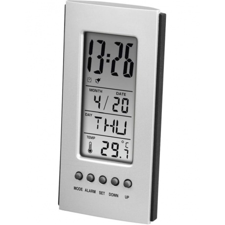 Термометр HAMA H-186357 сделан из пластика серебристого цвета. Компактные часы-термометр на своем светлом, большом экране показывают данные измерения температуры в помещении, текущую дату и время. Дисплей прибора монохромный, символы отображаются в черном цвете. Есть возможность выбора символов. С помощью кнопок на корпусе вы можете регулировать настройки прибора. Термометр HAMA H-186357 можно использовать как будильник с отложенным сигналом. Диапазон измерения температуры от -40 до +50 градусов. Электропитание происходит от батареек типа LR1130. Для удобства использования существует подсветка экрана.