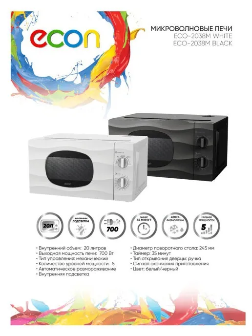Микроволновая печь Econ ECO-2038M White - стоимость товара 4900 руб. в интернет-магазине КотоФото. Характеристики, фото и описание доступны на карточке товара. Купить товар можно на сайте онлайн или заказать по телефону 8(812)426-98-99 в Санкт-Петербурге, а забрать в пункте самовывоза или оформить доставку на дом.