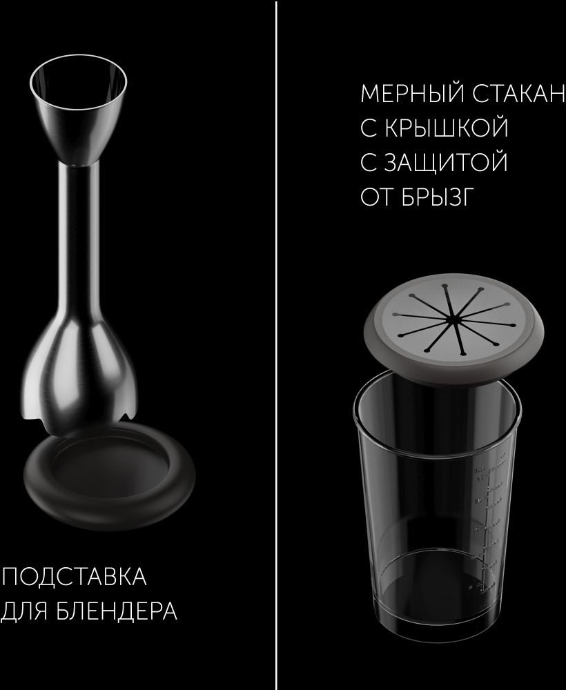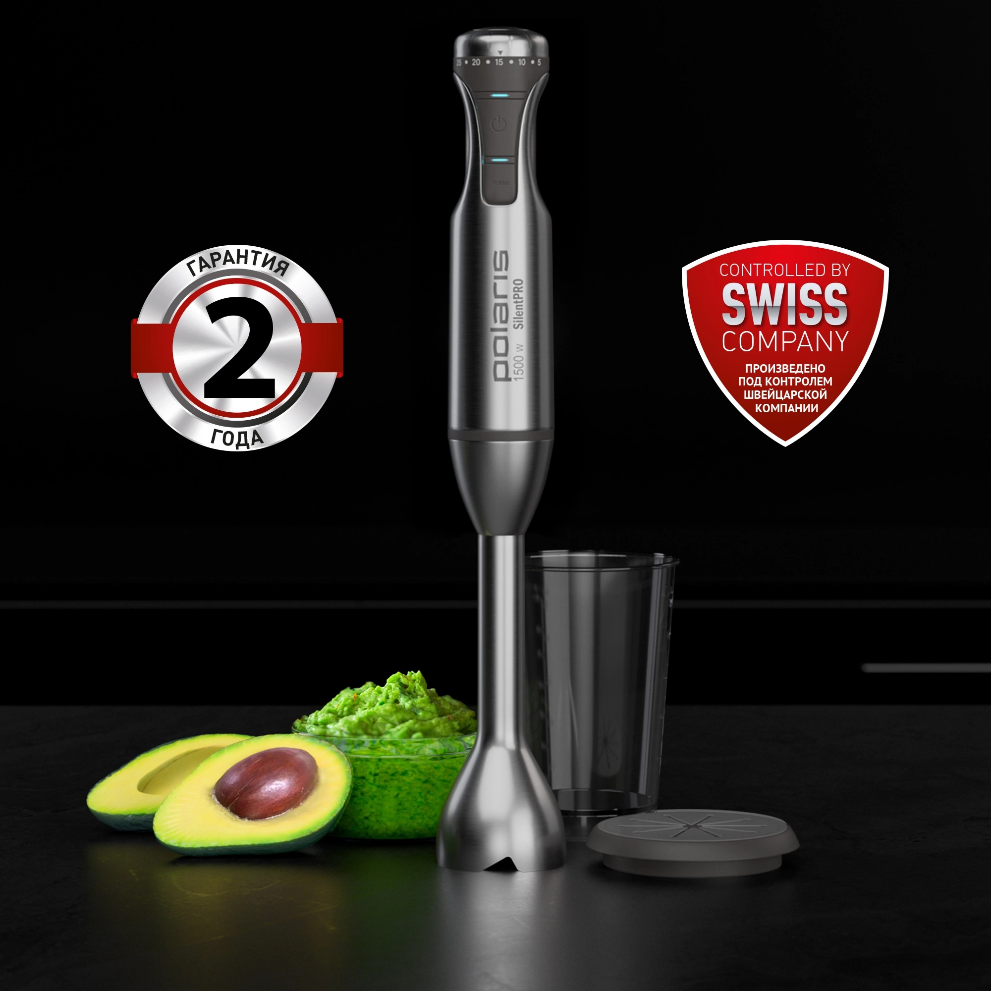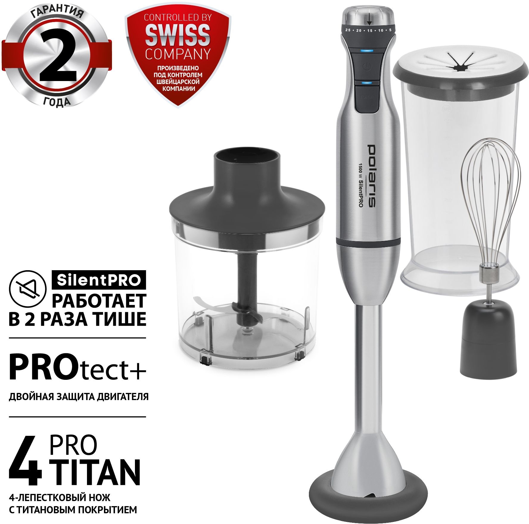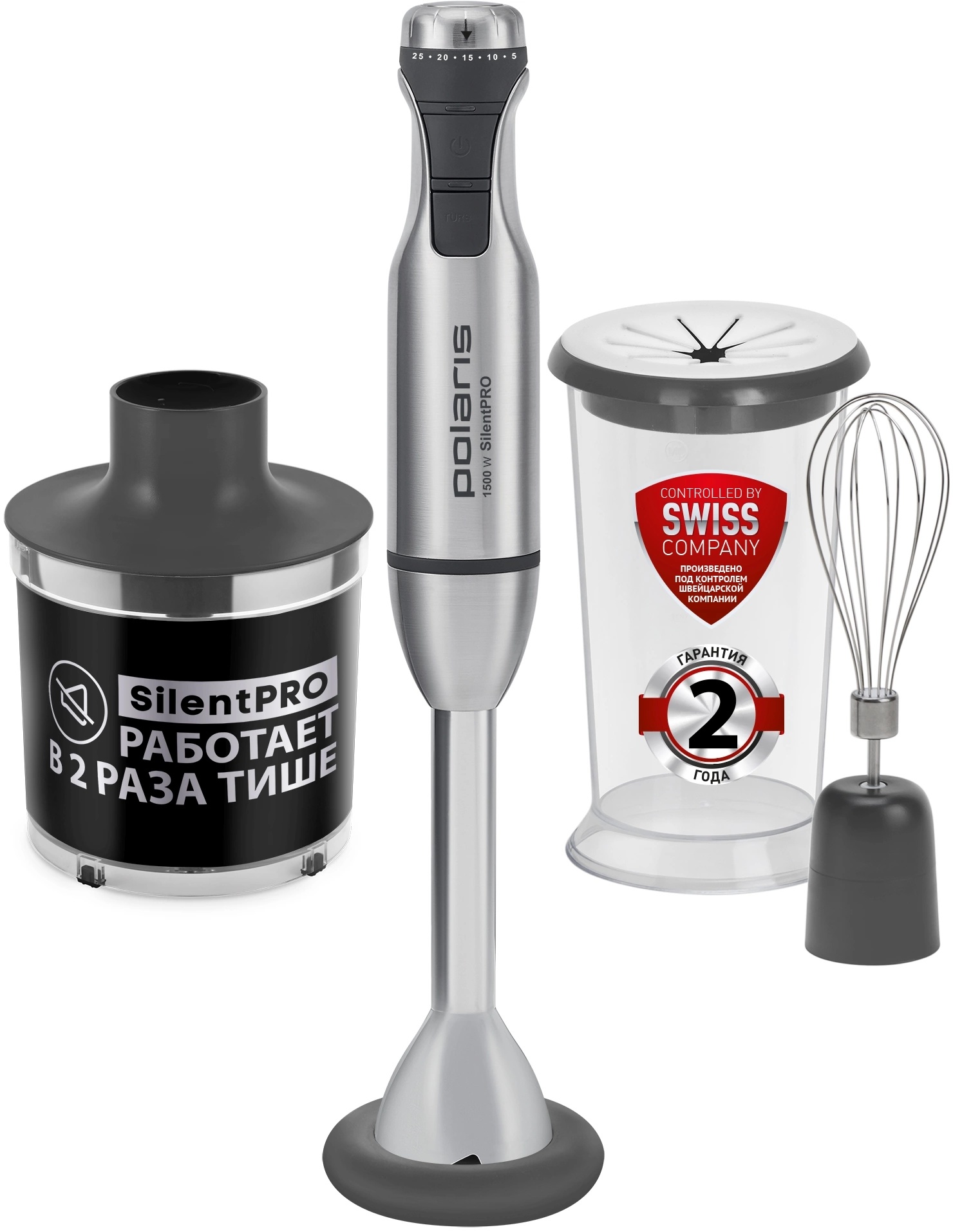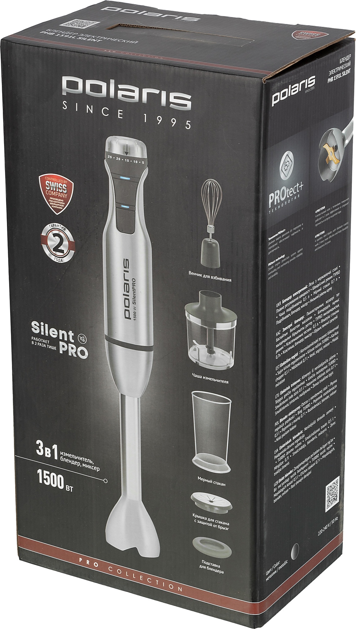 Комплектация блендера Один прибор. Две насадки. Безграничное поле для творчества. Это все о погружной блендер Polaris PHB 1591 L Silent. Имея в своем арсенале насадку для измельчения и венчик для взбивания эта машина сможет воплотить в жизнь любое ваше гастрономическое желание. Вариации скорости Имея мощность в 1500 Вт ваш домашний блендер способен работать на 25 скоростях и даже на турборежиме. Многие пользователи погружных блендеров сталкивались с проблемой перегрева мотора при работе турборежима, из-за чего они не могли пользоваться. Производители нашего блендера решили эту проблему, установив автоматическую защиту от перегрева. Когда датчики считают повышение температуры, то прибор автоматически выключиться. Дальнейшее ним можно будет только после полного остывания. Так производители обеспечили своих пользователей от несчастных випадкив. Залежно от ваших продуктов вы спокойно и плавно варьируете между нужным вам количеством оборотов с помощью простого управления. Также на дисплее есть подсветка режимов работы, которая дает вам понять скорость, на которой работает блендер, и в зависимости от этого уже регулировать нужную вам. Технология SilentPRO Одним из главных достоинств блендеров Polaris PHB 1591 L Silent является их бесшумность. Отличие этой модели от других своих собратьев это оригинальная технология компании Polaris - SilentPRO. Она делает работу блендера почти в два раза меньше. Отлично подойдет для тех, кого уже слишком раздражает шум мотора стандартных бытовых приборов. Вы полюбите наш блендер всем сердцем. Стиль - отличительная черта всей линейки В модели блендера Polaris PHB 1591 L Silent просматривается стиль всей линейки блендеров PHB - холодная сталь в сочетании с матовым черным придает прибору своей изюминки и вид дороговизны. Хотя и блендер находится в оптимальной ценовой категории, позволить которую могут себе почти все, выглядит он строго и выдержанно, как и полагается надежном прибора.