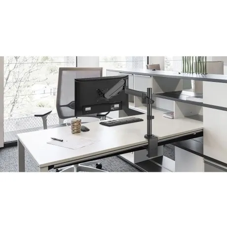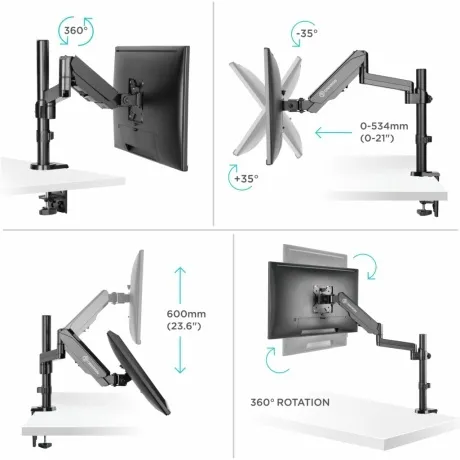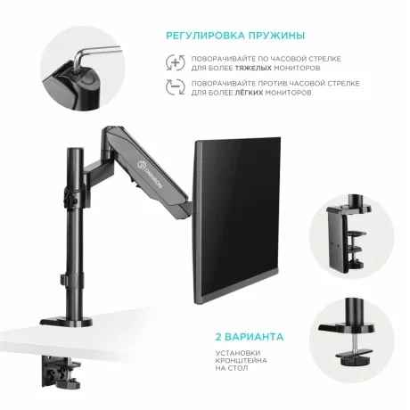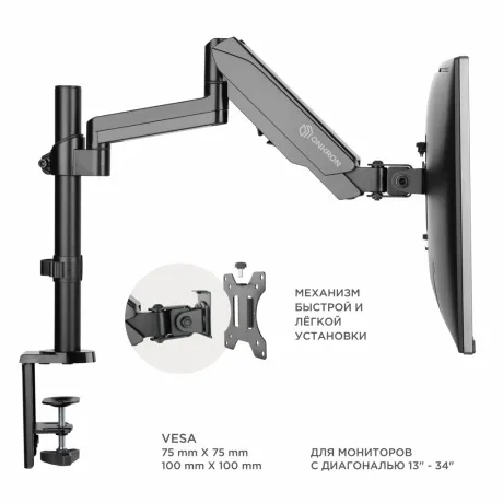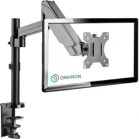 Настольный наклонно-поворотный кронштейн для монитора, выполненный по технологии газлифт, ONKRON G70 подходит для мониторов и телевизоров диагональю от 13 до 34 дюймов (33,02– 86,36 см) и весом от 1 до 8 кг. Механизм с возвратной пружиной и газовым амортизатором, располагающийся внутри корпуса кронштейна, даст возможность легко перемещать монитор в любую нужную вам позицию. Прочная конструкция из алюминия надежно его удержит. Кронштейн ONKRON G70 поможет вам освободить место для документов и офисного оборудования на компьютерном столе. Это стильное настольное крепление станет хорошим решением для вашего дома или офиса. Сложный технический процесс изготовления газовой пружины, качественные клапаны и износостойкая сталь цилиндра пружины в совокупности обеспечивают максимизацию преимуществ и удобств для пользователя, а именно: плавную регулировку положения монитора без рывков и отскоков, устойчивость в установленном положении независимо от веса монитора, значительный ресурс газовой пружины, рассчитанный минимум на 50.000 нагрузочных циклов. Кронштейн универсален за счет нескольких предусмотренных производителем размеров VESA – 75x75 мм и 100x100 мм. Встроенный в корпус кабель-канал позволит спрятать и зафиксировать провода для удобства и эстетичного внешнего вида. С углом наклона от -35 до +35 градусов можно максимально комфортным образом настроить монитор под индивидуальные параметры. Разместив его в нужном положении относительно положения за столом, Вы сохраните правильную осанку и хорошее зрение. Вы можете повернуть монитор вокруг своей оси на 180°. Это преимущество позволяет с легкостью регулировать углы обзора и делать просмотр более доступным из любой точки помещения. Специальный механизм, предусмотренный конструкцией кронштейна, позволит сделать процесс установки экрана более легким и быстрым. Производитель предусмотрел возможность разместить монитор вертикально – в портретной ориентации. Это преимущество добавляет удобства в работе дизайнеров, программистов.