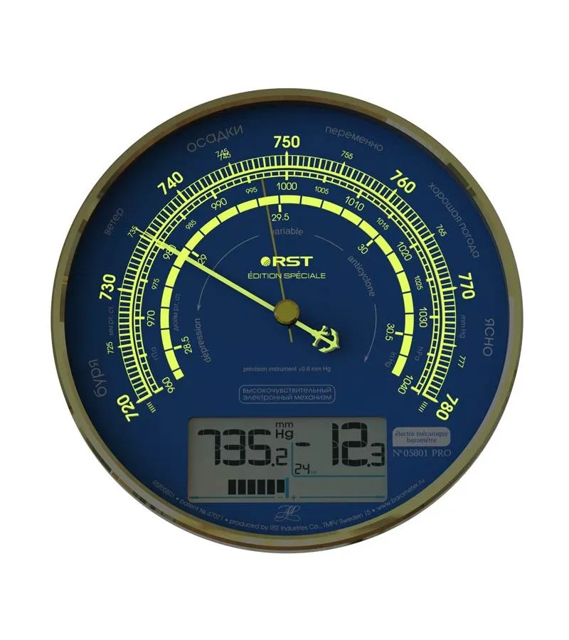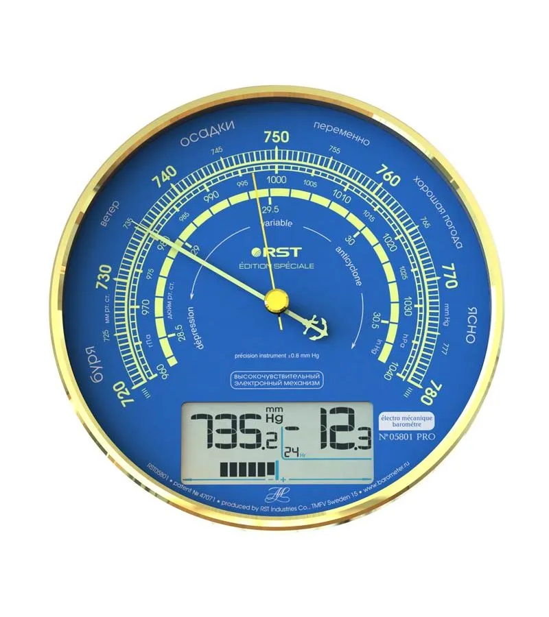 Барометр RST 5801 – компактный электро-механический прибор, представленный в округлом золотистом корпусе. Данные отображаются в виде цифр и понятных графических символов. Вы можете выбирать наиболее удобные единицы измерения, а также проводить ручную калибровку. Прибор RST 5801 действует от двух AA-батареек. Комфортной работе способствует наличие понятной индикации, оповещающей о низком уровне заряда. Устройство имеет габариты 16.5x16.5x4 см и не вызывает сложностей в эксплуатации. Данные измеряются через каждые 18 минут.
