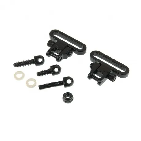 Быстросъемные антабки под ремень шириной до 2, 8 см, петли выдерживают усилие на разрыв 150 кг. Для установки антабки на оружие, не имеющее для нее ответной части, необходимо сначала ввинтить крепление в приклад и цевье. Затем винтовую головку антабки нужно выкрутить до упора, надавить на нее и освободившуюся скобу развернуть на 90°. Далее следует вставить ось антабки в крепление на оружии, вернуть скобу на место и завернуть винтовую головку до упора. Антабки не подвержены коррозии, устойчивы к перепадам температуры и неблагоприятным погодным условиям.