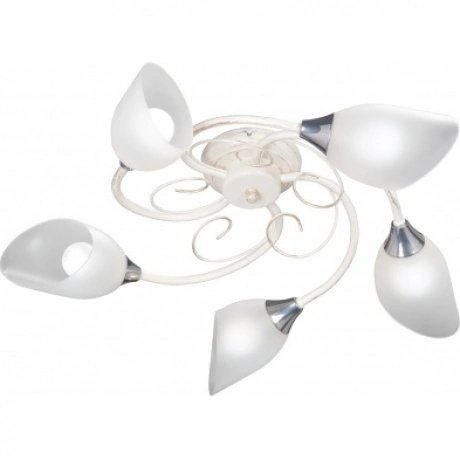 Потолочная люстра будет отлично смотреться в гостиной, спальне в стиле модерн. Люстра имеет 5 плафонов из белого стекла с цоколем 5xE14. Питание от сети 220V, общая максимальная мощность 200W позволяет осветить площадь до 10 кв. м.