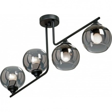 Потолочная люстра на штанге будет отлично смотреться в гостиной, прихожей и коридоре, спальне в стиле арт-деко. Люстра имеет 4 плафона из черного прозрачного стекла с цоколем 4xE27. Питание от сети 220V, общая максимальная мощность 160W позволяет осветить площадь до 8 кв. м.