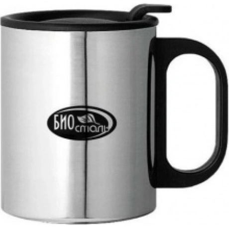 Термокружка из нержавеющей стали, с ручкой и крышкой. Вес 160 грамм. Диаметр 8,5 см, высота — 9,5 см.