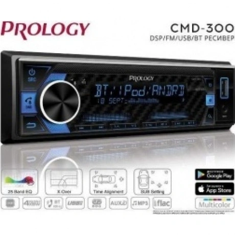 PROLOGY CMD-300 — FM / USB ресивер с Bluetooth и встроенным DSP - аудиопроцессором, стандартного размера 1DIN, который обеспечивает прием радиостанций в диапазоне FM / УКВ / AM и воспроизведение медиафайлов MP3, WAV, и FLAC форматов, записанных на USB накопители, передачу звука с внешних источников через линейный аудиовход и беспроводной интерфейс Bluetooth. Поддерживается управление мобильным телефоном через интерфейс Bluetooth (ver. 4, 2).