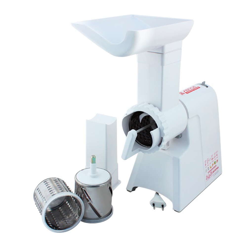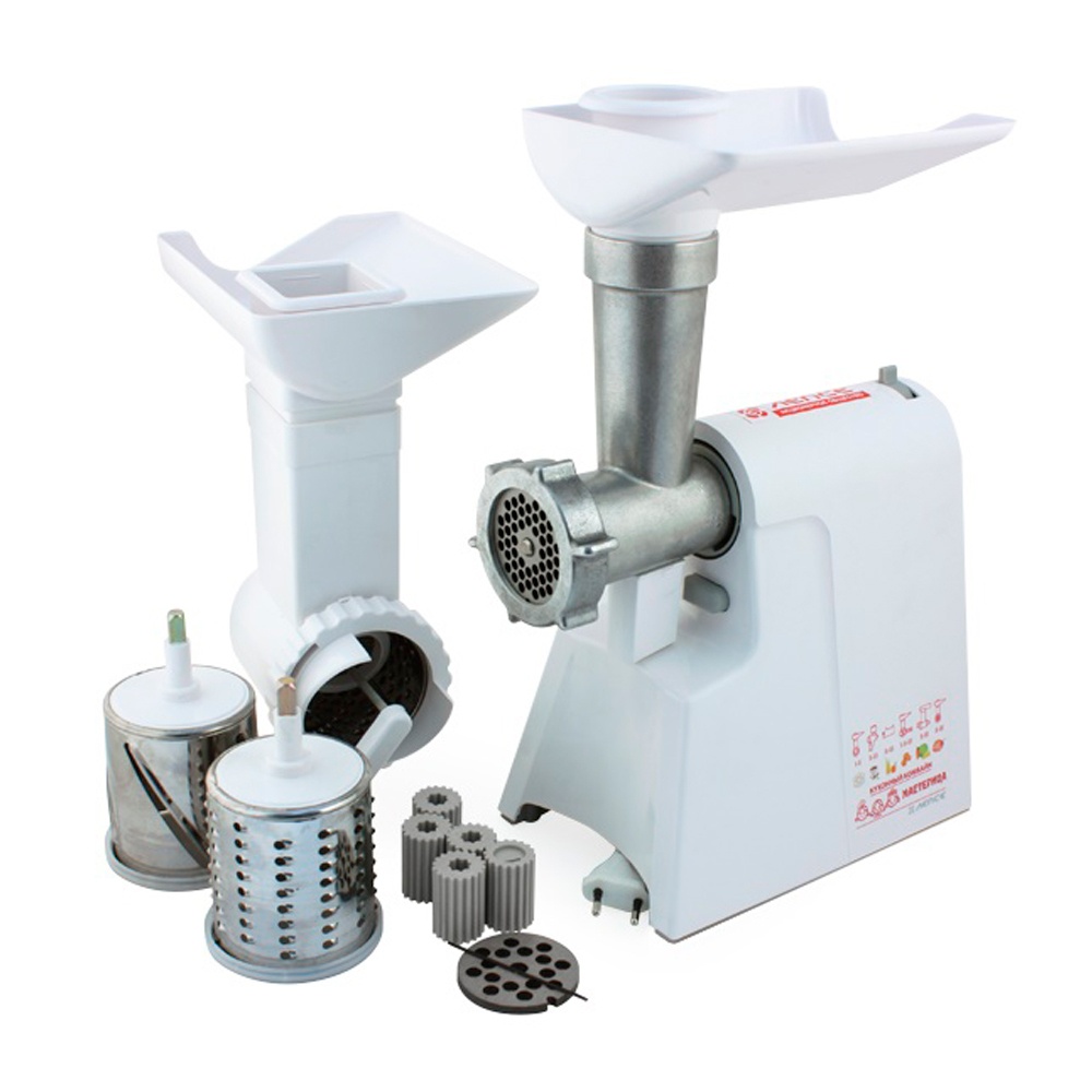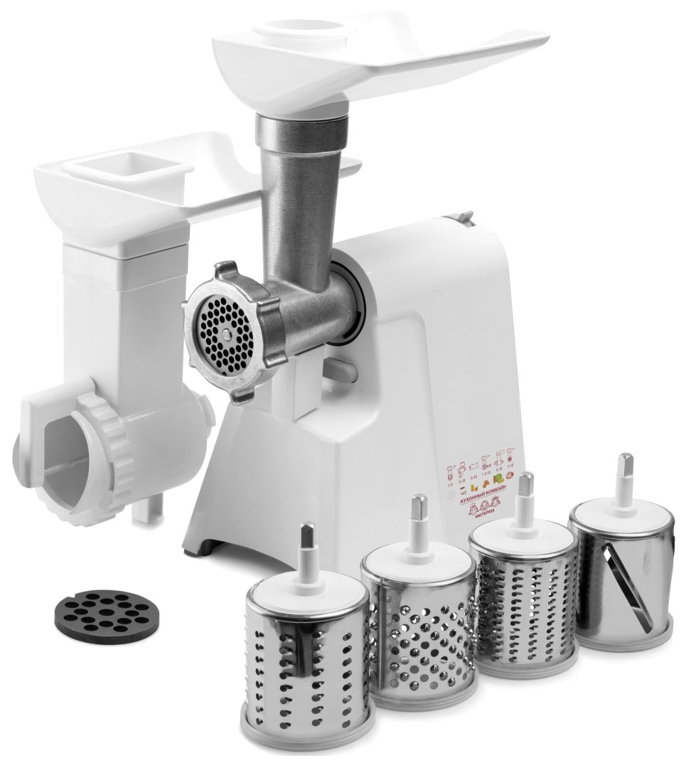 Мясорубка Мастерица КЭМ-02 станет незаменимой помощницей на кухне практичной хозяйки. Максимальная мощность такого устройства составит 600 Вт. С помощью этой мясорубки можно переработать за час 40 кг. В комплект входят пять запасных переходников, два перфорированных диска (4.4 мм, 7 мм) и три барабана для шинкования и перетирания продуктов с отдельным толкателем и лотком.