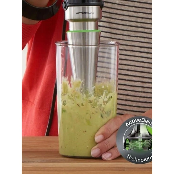 Ручной блендер даже без дополнительных насадок довольно универсален и может применяться для решения разнообразных кулинарных задач. Но кроме стандартных лезвий ActiveBlade, всегда есть возможность быстро подключить специальные аксессуары: небольшую мельничку для измельчения свежих специй или зерен кофе, закрытую насадку-измельчитель (500 мл.) с дополнительным ножом для колки льда и металлический широкий венчик для взбивания. Также в комплектацию включен пластиковый мерный стакан (600 мл.) с нанесенной на стенки шкалой. Система быстрого подключения EasyClick Plus обеспечивает надежную фиксацию насадок во время обработки ингредиентов и легкость их извлечения, как только работа с блендером будет завершена.