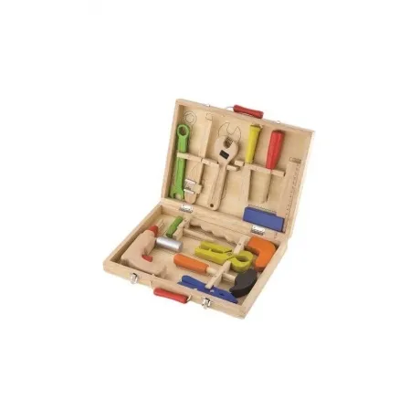 Теперь ребенок сможет подражать своему отцу и вместе с ним чинить, крутить с помощью инструментов. Удобный чемоданчик включает в себя 12 аксессуаров, необходимых для маленького мастера, в комплект входят: отвертка, молоток, гаечный ключ, рожковый ключ, разводной ключ, дрель, пилу, плоскогубцы, торцовый ключ, монтажный шпатель, щипцы. Все в удобной деревянной коробке, выполненной из лакированного дерева, окрашенной безопасными для ребенка красками в яркие цвета, которые порадуют любого пользователя.