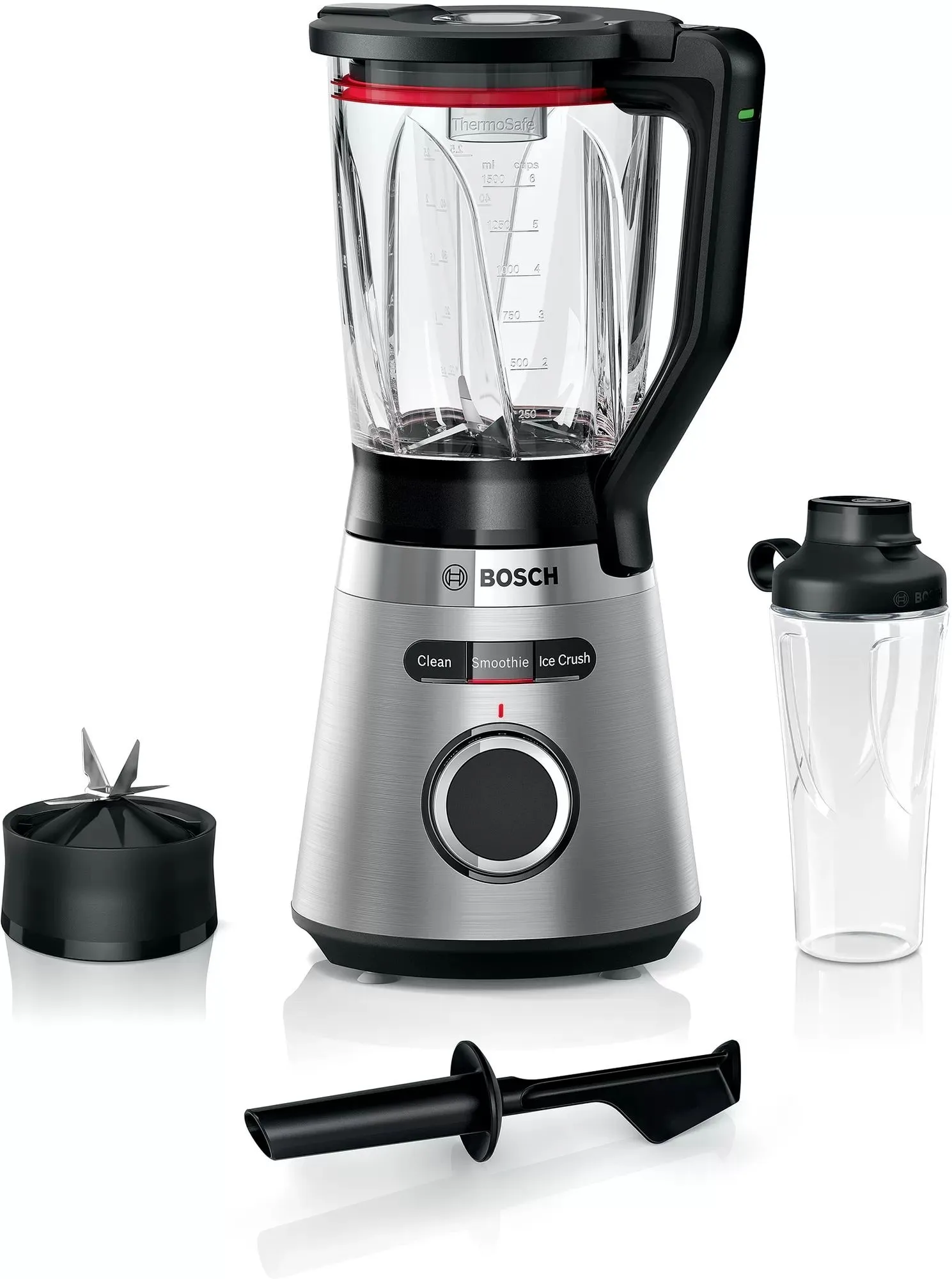 Блендер Bosch MMB6384MМощный стационарный блендер с долговечной стеклянной чашей ThermoSafe и корпусом из нержавеющей стали. Готовьте нежные смузи с однородной кремовой текстурой, благодаря двигателю мощностью 1200 Вт и системе ProPerformance.Система Pro-Performance: идеальная текстура смузи даже из замороженных, твердых и волокнистых ингредиентов.Надежный двигатель Bosch: мощность 1200 Вт со скоростью вращения до 30 000 об / мин.Крышка блендера с отверстием для порционного налива: аккуратно и без необходимости открывать крышку.Готовьте смузи прямо в бутылочке ToGo с защитой от протечек: наслаждайтесь смузи на ходу легко и без забот.Простота сборки и эксплуатации: легкая фиксация чаши, продуманное хранение кабеля внутри корпуса и толкатель.