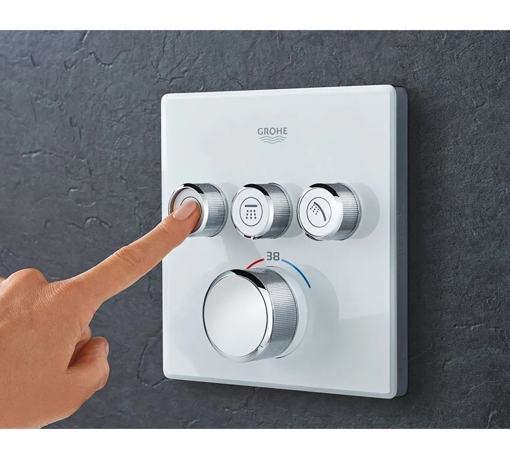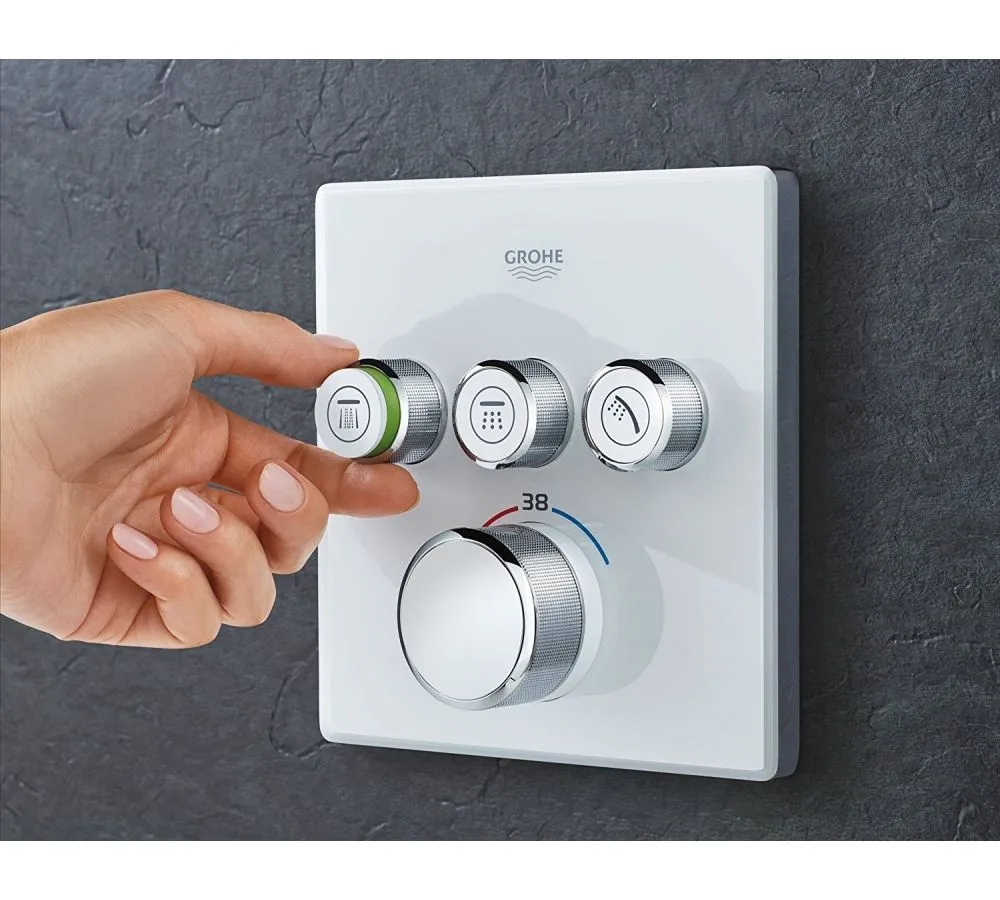 Встраиваемый элегантный термостат обладает необычным цветом «белая луна». На виду остается только небольшая металлическая панель с тремя кнопками SmartControl и регулятор температуры воды. При нажатии «умных» кнопок происходит включение/выключение воды в выбранном устройстве – ручном, верхнем душе или изливе для ванны, их поворот регулирует напор от минимального водосберегающего EcoJoy до максимального. Благодаря фирменной технологии GROHE TurboStat будет обеспечена подача воды заданной температуры, а стопор безопасности, останавливающий поток при повышении температуры выше 38 °С, поможет уберечься от внезапного ошпаривания. Металлические элементы термостата выполнены из латуни – материала, стойкого к воздействию коррозии. Фирменное хромированное покрытие GROHE StarLight не тускнеет со временем и сохранит безупречный блеск на долгие годы.