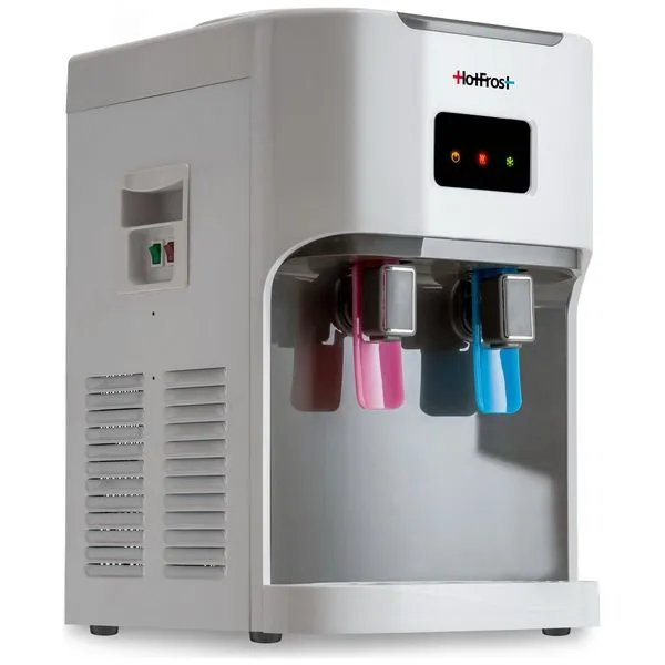 Диспенсер HotFrost D115 – настольная модель с верхним расположением бутыли. Компрессорное охлаждение позволяет производить по 2 л ледяной воды в час, нагреть за это же время можно 5.5 л. Краны срабатывают при нажатии на пластину кружкой – удобная функция, особенно актуальная в период распространения инфекции (позволяет избежать прикосновения к прибору руками). HotFrost D115 компактный, легкий, прекрасно подходит для кейтеринга и других выездных мероприятий. Он занимает минимум места, но производительность у него не меньше, чем у напольных моделей. Дизайн лаконичный, подойдет практически для любого интерьера. Съемный поддон для сбора капель помогает содержать в порядке место вокруг диспенсера. Бойлер и компрессор выключаются независимо друг от друга, что позволяет экономить электроэнергию, когда какая-то одна функция не востребована.