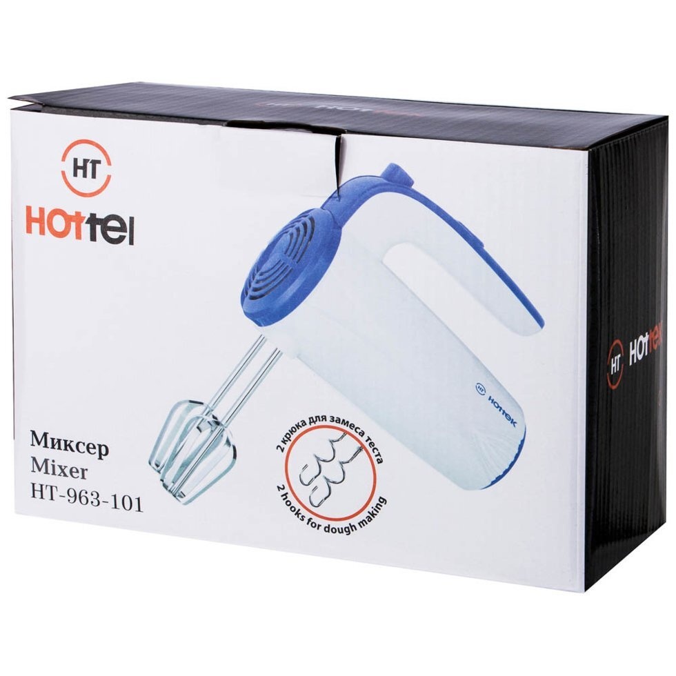 Миксер HT-963-101 – достаточно мощный прибор, который справится с ингредиентами различной плотности. Модель удобна и проста в использовании, занимает мало места на кухне. Мощность мотора составляет 250 Вт. Имеется 5 скоростей вращения. В комплект входят 2 венчика для взбивания и 2 крюка для замеса теста. Менять их достаточно просто, отсоединяются они при помощи специальной кнопки на корпусе.