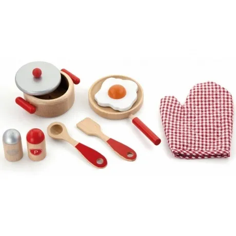 А вы думали о том, что даже известные повара когда-то были детьми? Возможно, их любовь к профессии зародилась, когда они с важным видом готовили из песка свои первые кулинарные шедевры. Игровой набор от Viga Toys Маленький повар предназначен для малышей от 2 лет. Он позволит окунуться в магию собственной кухни и почувствовать себя великим кулинаром. Ребенок сможет самостоятельно, без помощи взрослых, приготовить свои виртуальные блюда и даже приправить их воображаемыми специями из деревянной перечницы. Он с легкостью пожарит игрушечную яичницу или наварит импровизированного супа с посудой из набора. В детский кухонный набор входят: сковорода с яйцом и кастрюля с крышкой, кухонная лопатка и половник, две баночки для специй, прихватка. Все элементы выполнены в контрастных красно-белых цветах и исключительно из природных материалов. Они максимально реалистичные и детально проработанные. С таким набором кулинара играть в ролевые игры станет еще интереснее. Дети будут готовить то, что посчитают нужным, и при этом оставаться в полной безопасности. Они смогут дать волю фантазии, станут более креативными и уверенными в своих способностях. Игровой набор от Viga Toys Маленький повар рекомендован для детских садов и центров развития. Подходит для обучения в рамках методик Монтессори и Реджио.