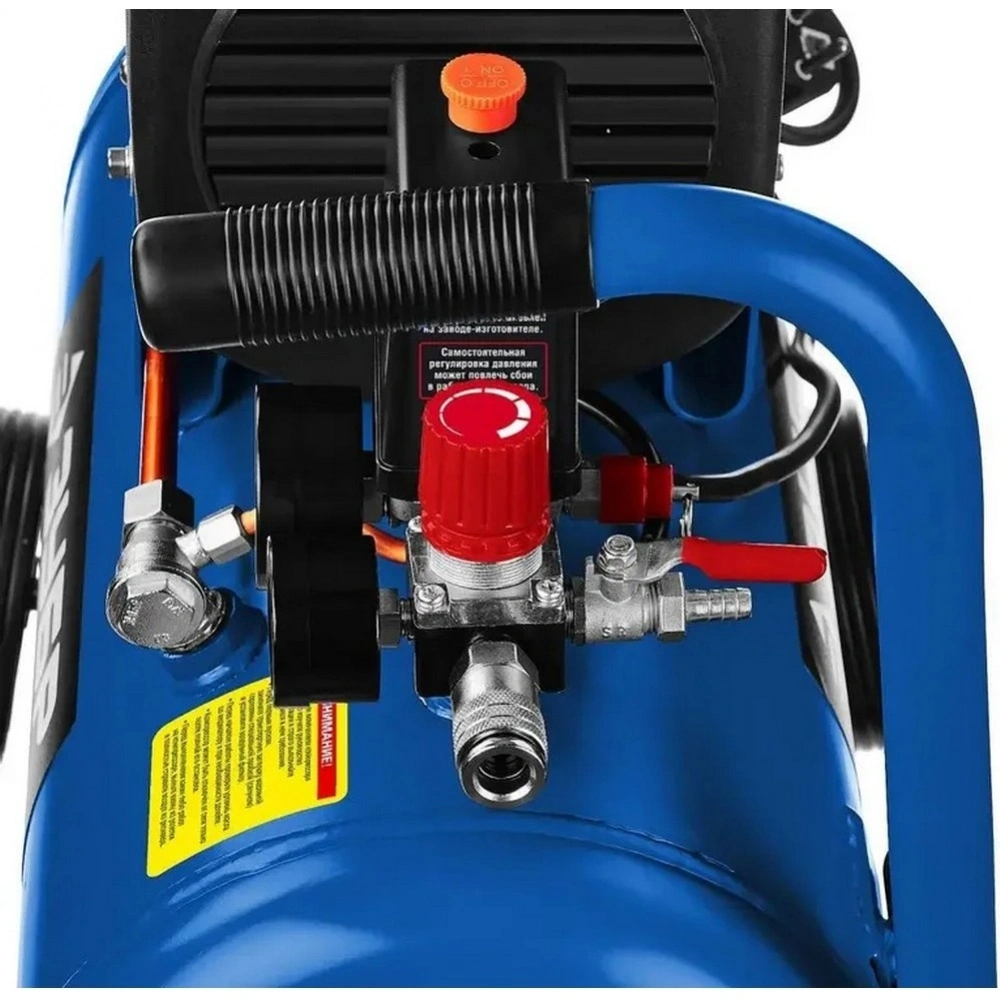 Компрессор обеспечивает максимальное давление в 8 Бар, что позволяет ему справляться с большинством пневматических инструментов и задач. Вместительный ресивер объемом 24 литра гарантирует стабильную работу без постоянных перерывов на подкачку. Ширина устройства составляет 62 см, что делает его устойчивым и удобным для эксплуатации.