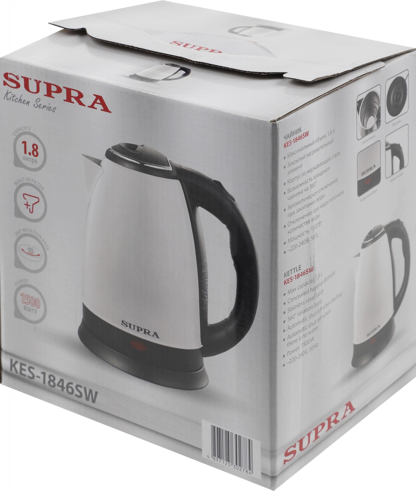 Стильный электрический чайник SUPRA KES-1846SW из нержавеющий стали белого цвета станет оригинальным украшением вашей кухни и прекрасным подарком друзьям и родственникам на любой праздник или новоселье. Чайник прост в управлении и имеет оптимальный набор характеристик. Объем 1,8 литра и мощность 1500 Вт позволяют быстро вскипятить воду на всю семью, а благодаря вращающейся на 360 градусов подставке, можно повернуть носик чайника в удобное положение. В основании чайника имеется отсек для шнура, с помощью которого вы можете оставить шнур того размера, который нужен именно на вашей кухне.