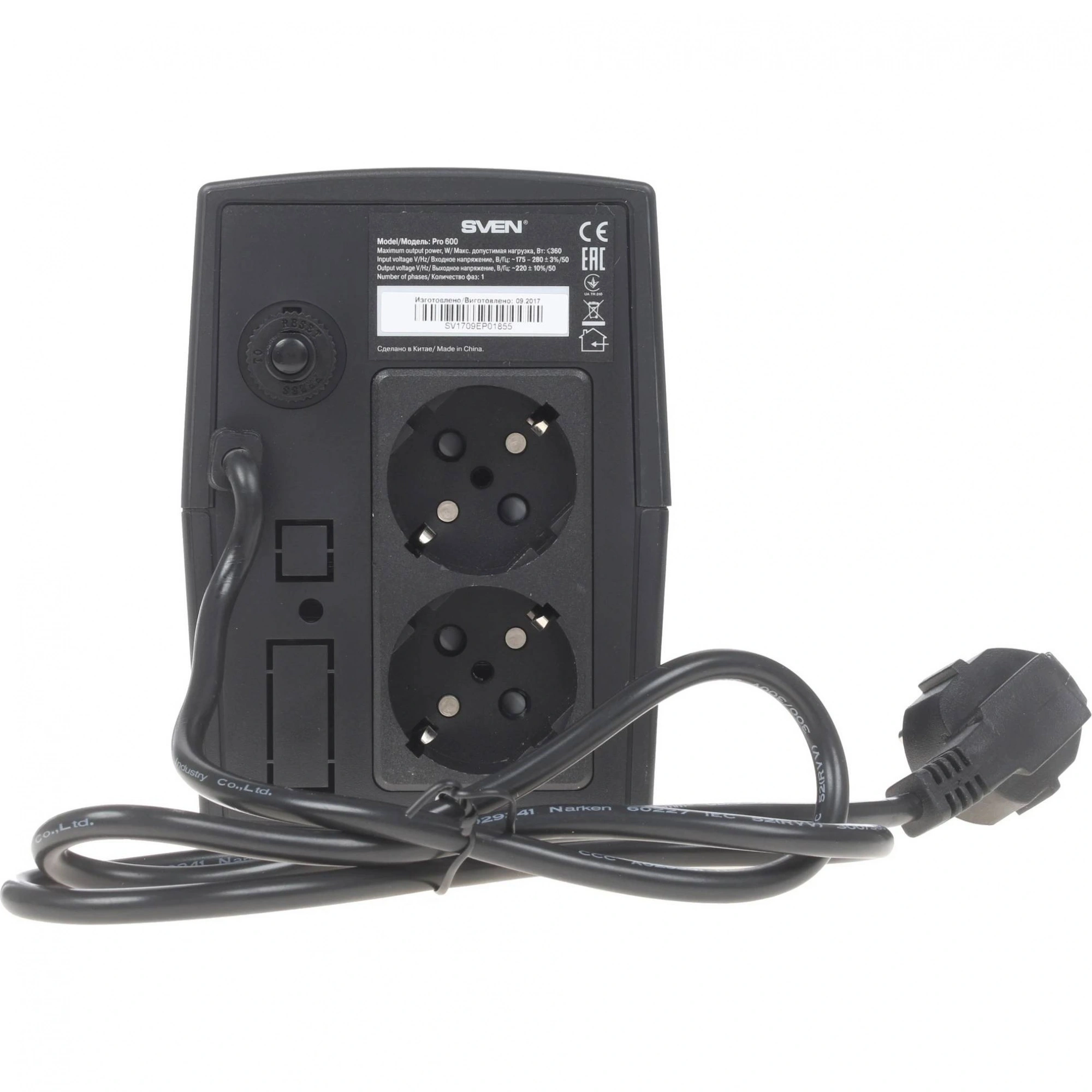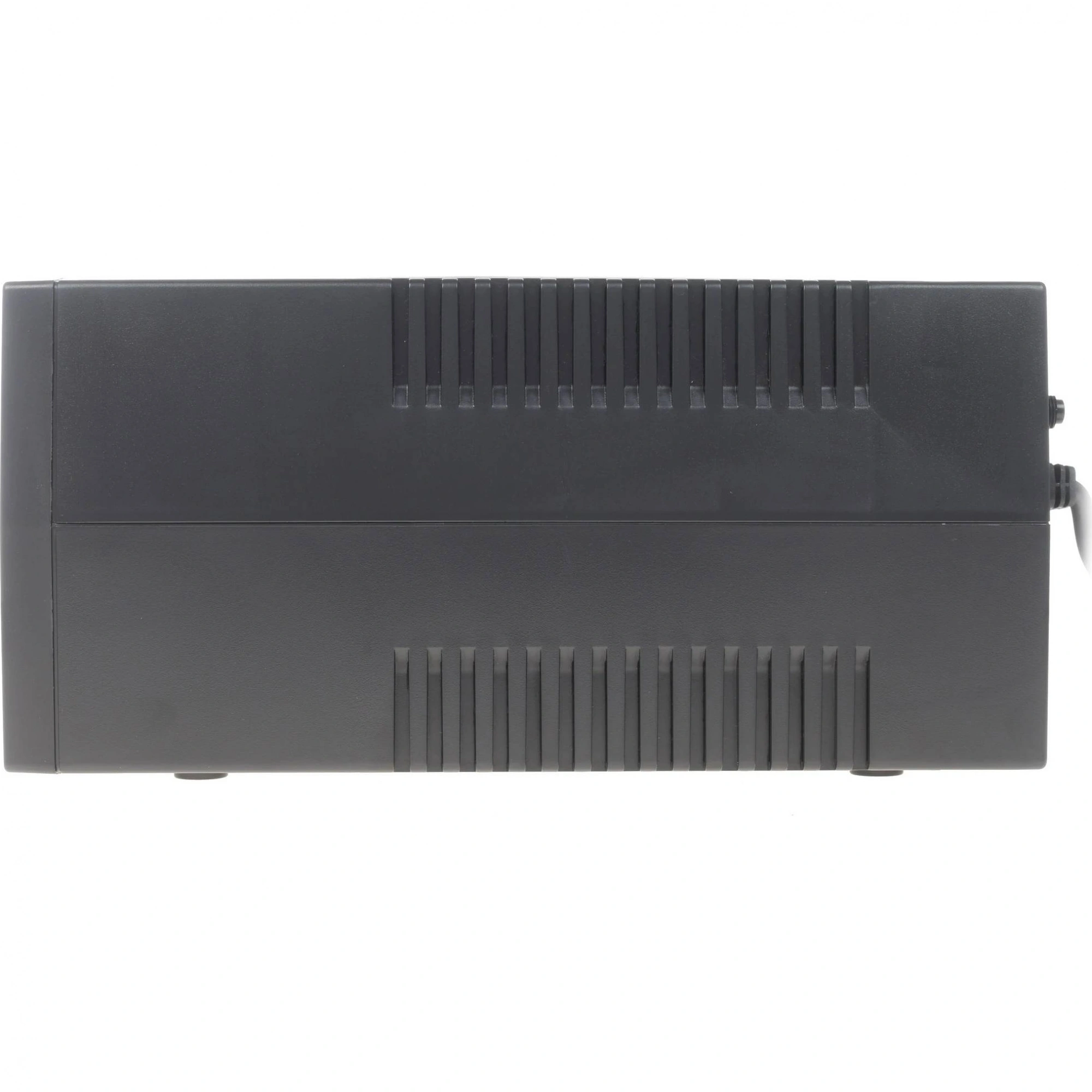 С одной стороны, ключевые характеристики включают активную мощность в 360 Вт и полную мощность в 600 В·А, что позволяет устройству эффективно поддерживать работу подключенных устройств в кратковременных случаях отключения электроэнергии. ИБП оснащен двумя розетками, что достаточно для подключения основных приборов.