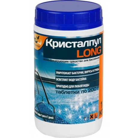 Дезинфицирующее средство для бассейнов Кристалпул LONG таблетки 5 штук по 200г, 1кг имеют в основе активное вещество - медленный хлор, благодаря чему обеспечена постоянная дезинфекция бассейна. Состав таблеток также эффективно уничтожает вирусы, грибы и бактерии. Осветляет воду.