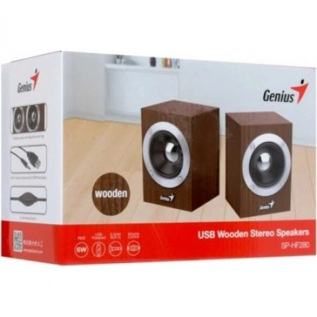 Корпусы колонок 2.0 Genius SP-HF280 выполнены из МДФ. Их дизайн имитирует дерево. Смотрится такое решение очень стильно. Мощность звучания фазоинверторного акустического оформления составляет 6 Вт. Диапазон воспроизводимых частот варьируется от 100 до 20000 Гц. Регулятор громкости колонок расположен снаружи. Дополнительное достоинство колонок – их небольшие размеры. Каждая из них обладает габаритами 14x10x10 см. Это значит, что места для колонок 2.0 Genius SP-HF280 на столе много не потребуется. Все эти характеристики делают устройство идеальным дополнением ко встроенной акустической системе компьютера или ноутбука.