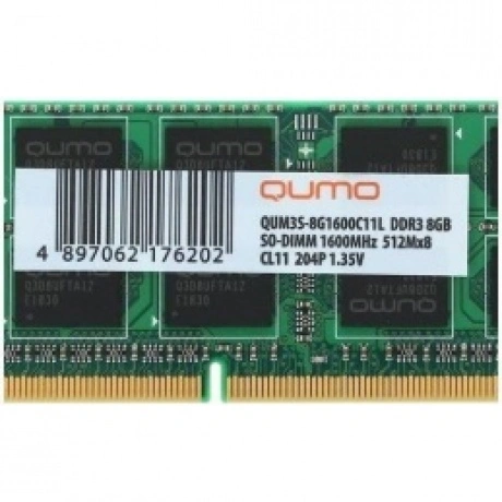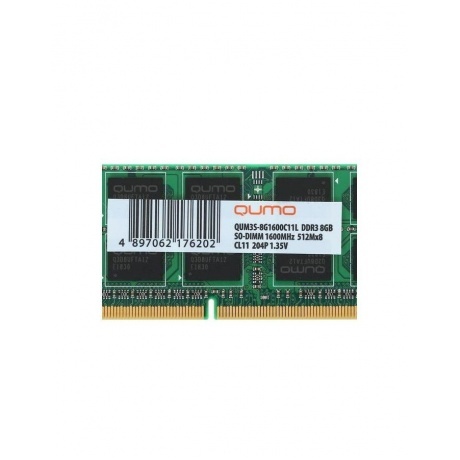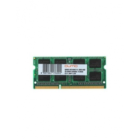 Qumo QUM3S-8G1600C11L 8 ГБ работает от напряжения 1.35 В. Тайминги CAS Latency – 11. Модуль имеет привычные габариты для данного стандарта, установка в слот не вызовет затруднений. В конструкции 204 контакта для соединения с материнской платой.