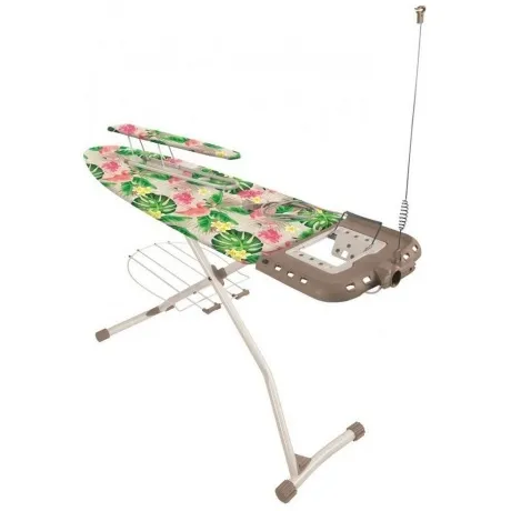 Модель имеет автоматический многоуровневый регулятор, который позволяет поднимать доску на высоту до 1 м. Чтобы доска могла использоваться вместе с парогладильной техникой, у модели предусмотрена подставка под утюг либо не очень большой парогенератор, вес которого не превышает 10 кг. Металлическая ножка из двух раскладывающихся частей предотвращает качание доски во время работы, а противоскользящие наконечники на концах ножек не повреждают напольное покрытие. От случайного складывания защищает специальный стопор.