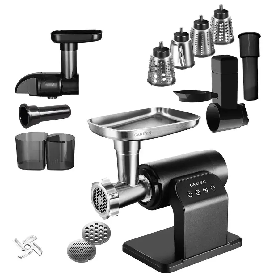 Garlyn MG-5000 сочетает в себе функционал сразу 3 устройств. Помимо основного блока мясорубки со всеми необходимыми насадками в комплектации присутствуют сменные блоки (овощерезка и соковыжималка).