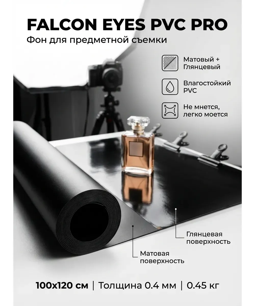 Фон пластиковый PVC PRO 100х120MR отлично подойдет в случае, когда требуется однотонная черная матовая или глянцевая поверхность для фото- или видеосъемок. Малый вес фона (0.45 кг) и компактные размеры рулона (100х6х6 см) сделают его незаменимым как в небольшой офисной, так и в профессиональной фотостудии.