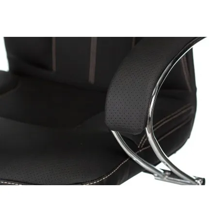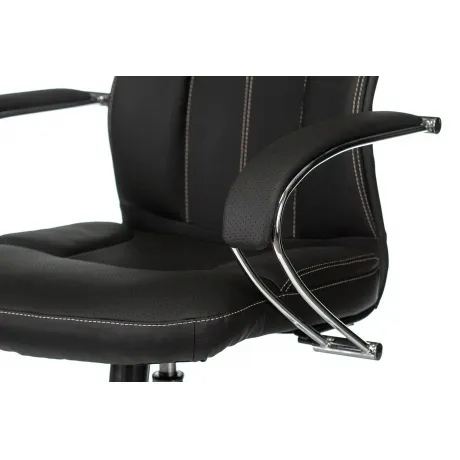 Механизм качания с регулировкой под вес и фиксацией в вертикальном положении. Регулировка высоты (газлифт). Подлокотники металлические крашеные цвет черный с накладками из искусственной кожи. Крестовина хромированная. Ограничение по весу: 120 кг. Соответствует стандарту BIFMA. Материал обивки: искусственная кожа перфорированная. Масса: 15,70 кг. Объем: 0,149 м3. Габариты (мм): 910 х 250 х 655.